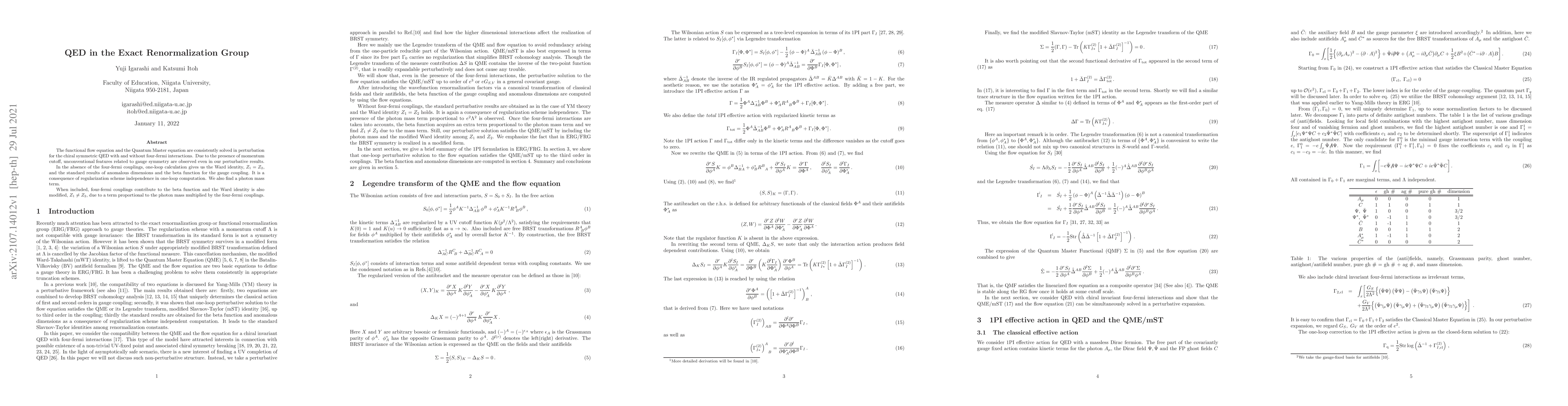 The functional flow equation and the Quantum Master equation are consistently solved in perturbation for the chiral symmetric QED with and without four-fermi interactions. Due to the presence of momentum cutoff, unconventional features related to gauge symmetry are observed even in our perturbative results. In the absence of the four-fermi couplings, one-loop calculation gives us the Ward identity, $Z_{1}=Z_{2}$, and the standard results of anomalous dimensions and the beta function for the gauge coupling. It is a consequence of regularization scheme independence in one-loop computation. We also find a photon mass term. When included, four-fermi couplings contribute to the beta function and the Ward identity is also modified, $Z_{1} \neq Z_{2}$, due to a term proportional to the photon mass multiplied by the four-fermi couplings.