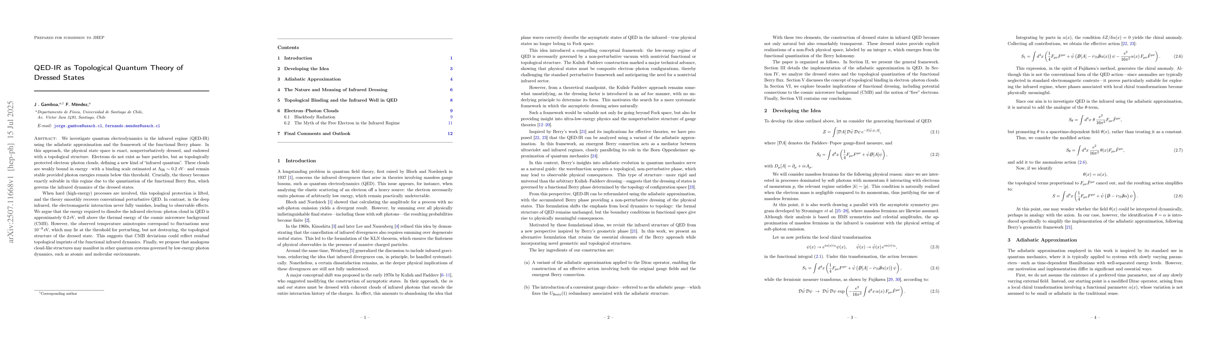 We investigate quantum electrodynamics in the infrared regime (QED-IR) using the adiabatic approximation and the framework of the functional Berry phase. In this approach, the physical state space is exact, nonperturbatively dressed, and endowed with a topological structure. Electrons do not exist as bare particles, but as topologically protected electron-photon clouds, defining a new kind of infrared quantum. These clouds are weakly bound in energy -- with a binding scale estimated at $\Lambda_{\text{IR}} \sim 0.2$ eV -- and remain stable provided photon energies remain below this threshold. Crucially, the theory becomes exactly solvable in this regime due to the quantization of the functional Berry flux, which governs the infrared dynamics of the dressed states. When hard (high-energy) processes are involved, this topological protection is lifted, and the theory smoothly recovers conventional perturbative QED. In contrast, in the deep infrared, the electromagnetic interaction never fully vanishes, leading to observable effects. We argue that the energy required to dissolve the infrared electron-photon cloud in QED is approximately 0.2 eV, well above the thermal energy of the cosmic microwave background (CMB). However, the observed temperature anisotropies correspond to fluctuations near $10^{-9}$ eV, which may lie at the threshold for perturbing, but not destroying, the topological structure of the dressed state. This suggests that CMB deviations could reflect residual topological imprints of the functional infrared dynamics. Finally, we propose that analogous cloud-like structures may manifest in other quantum systems governed by low-energy photon dynamics, such as atomic and molecular environments.