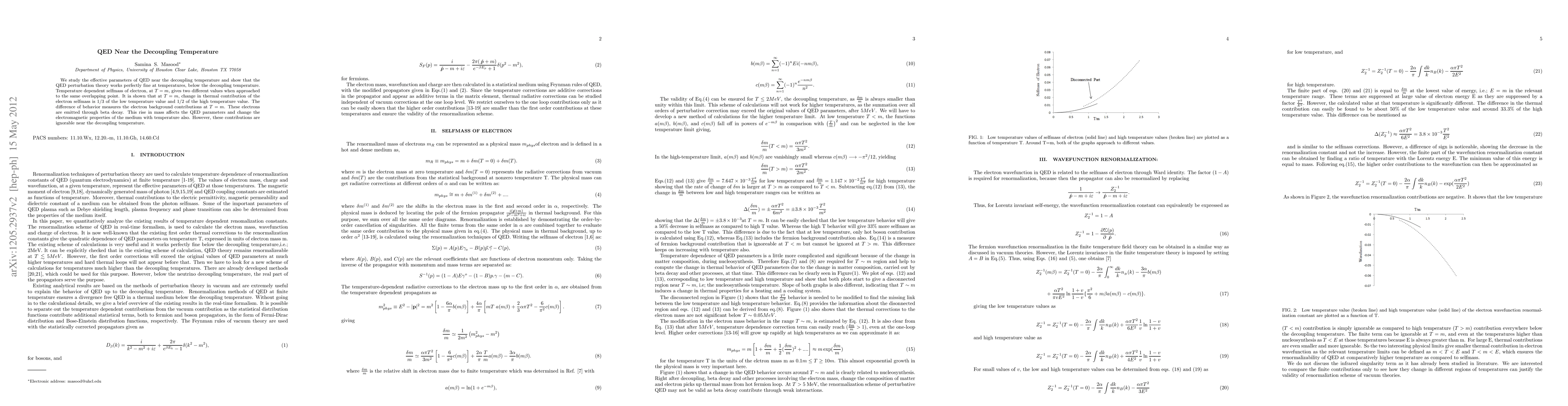 We study the effective parameters of QED near the decoupling temperature and show that the QED perturbation theory works perfectly fine at temperatures, below the decoupling temperature. Temperature dependent selfmass of electron, at T=m gives two different values, if approached to the same overlapping point. It ia shown that at $T=m$, change in thermal contribution of the electron selfmass is 1/3 of the low temperature value and 1/2 of the high temperature value. The difference of behavior measures the electron background contributions at T=m. These electrons are emitted through beta decay. This rise in mass affects the QED parameters and change the electromagnetic properties of the medium with temperature also. However, these contributions are ignorable near the decoupling temperature.