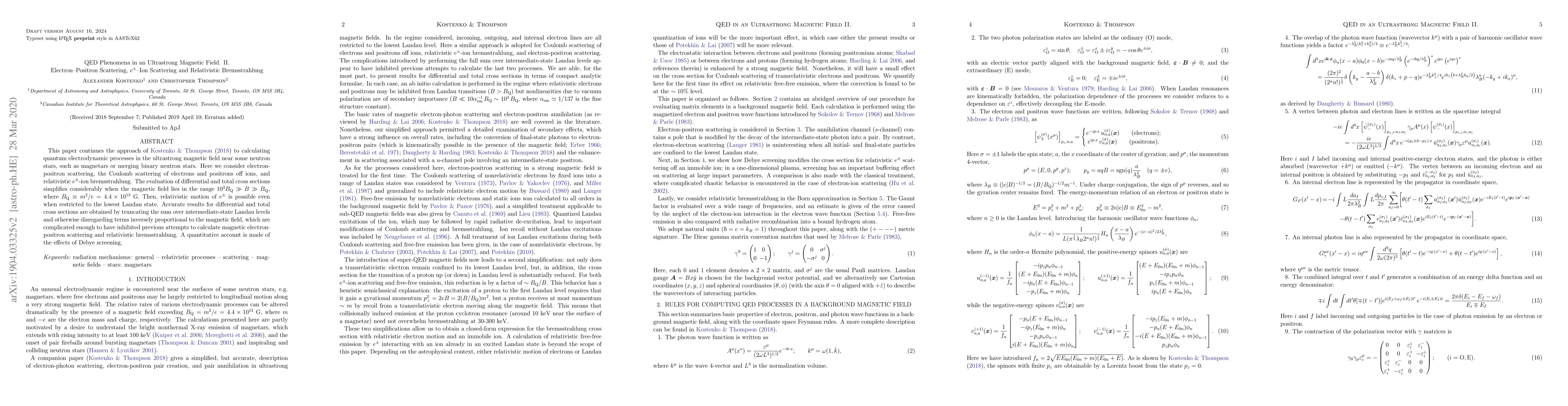 This paper continues the approach of Kostenko \& Thompson to calculating quantum electrodynamic processes in the ultrastrong magnetic field near some neutron stars, such as magnetars or merging binary neutron stars. Here we consider electron-positron scattering, the Coulomb scattering of electrons and positrons off ions, and relativistic $e^\pm$-ion bremsstrahlung. The evaluation of differential and total cross sections simplifies considerably when the magnetic field lies in the range $10^3B_{\rm Q} \gg B \gg B_{\rm Q}$, where $B_{\rm Q} \equiv m^2/e = 4.4\times 10^{13}$ G. Then, relativistic motion of $e^\pm$ is possible even when restricted to the lowest Landau state. Accurate results for differential and total cross sections are obtained by truncating the sum over intermediate-state Landau levels and otherwise disregarding terms inversely proportional to the magnetic field, which are complicated enough to have inhibited previous attempts to calculate magnetic electron-positron scattering and relativistic bremsstrahlung. A quantitative account is made of the effects of Debye screening.
