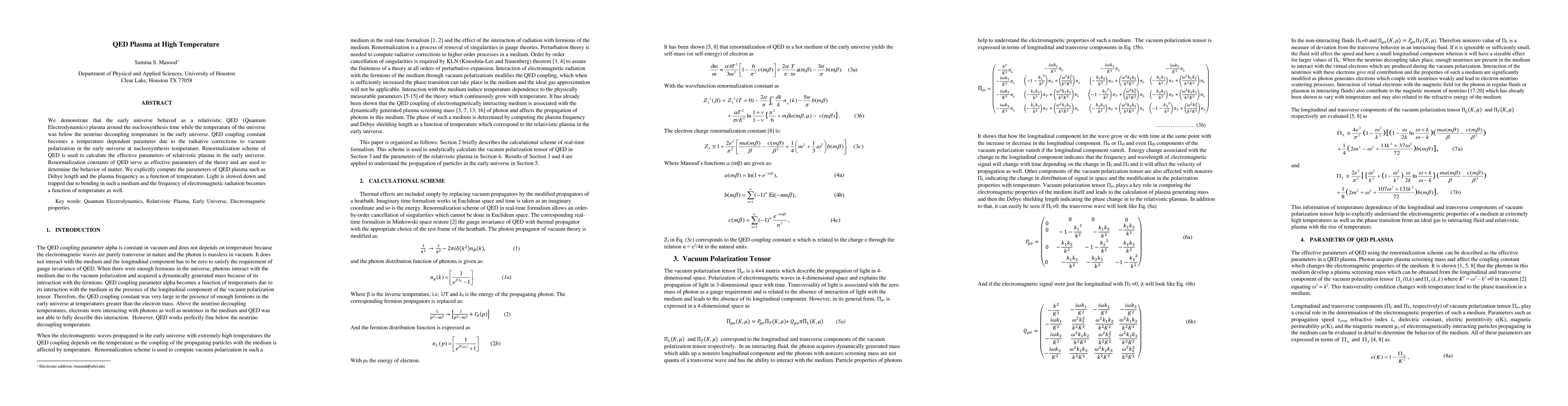 This paper investigates the behavior of a relativistic QED plasma in the early universe during nucleosynthesis, showing that the QED coupling constant varies with temperature due to vacuum polarization. It uses renormalization to determine effective parameters and computes QED plasma characteristics like Debye length and plasma frequency.