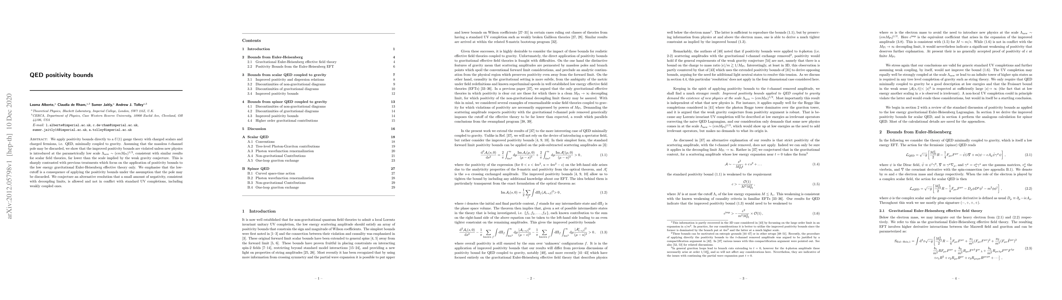 We apply positivity bounds directly to a $U(1)$ gauge theory with charged scalars and charged fermions, i.e. QED, minimally coupled to gravity. Assuming that the massless $t$-channel pole may be discarded, we show that the improved positivity bounds are violated unless new physics is introduced at the parametrically low scale $\Lambda_{\rm new} \sim (e m M_{\rm pl})^{1/2}$, consistent with similar results for scalar field theories, far lower than the scale implied by the weak gravity conjecture. This is sharply contrasted with previous treatments which focus on the application of positivity bounds to the low energy gravitational Euler-Heisenberg effective theory only. We emphasise that the low-cutoff is a consequence of applying the positivity bounds under the assumption that the pole may be discarded. We conjecture an alternative resolution that a small amount of negativity, consistent with decoupling limits, is allowed and not in conflict with standard UV completions, including weakly coupled ones.