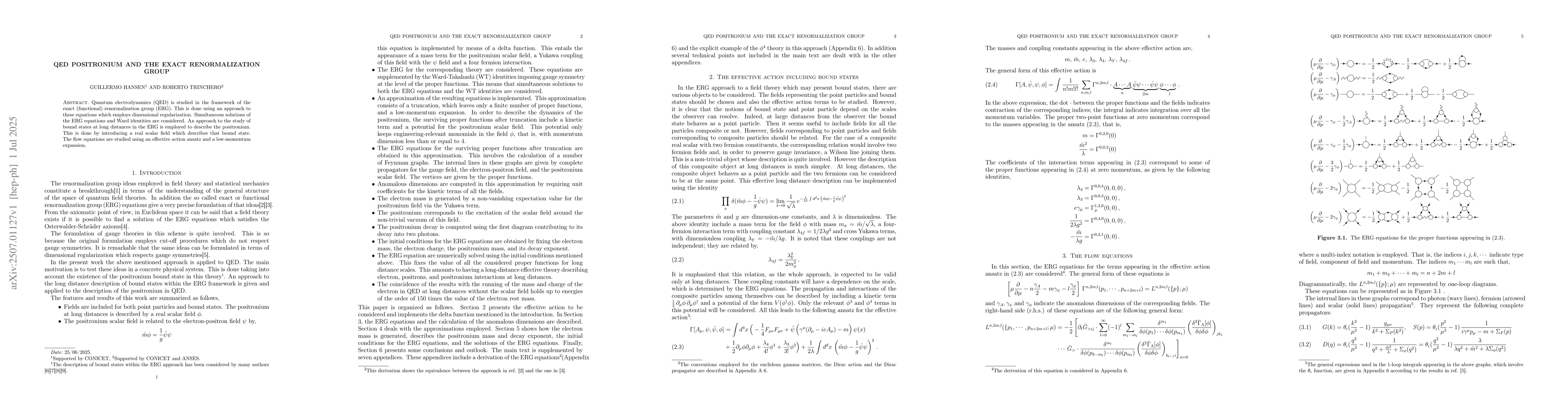 Quantum electrodynamics (QED) is studied in the framework of the exact (functional) renormalization group (ERG). This is done using an approach to these equations which employs dimensional regularization. Simultaneous solutions of the ERG equations and Ward identities are considered. An approach to the study of bound states at long distances in the ERG is employed to describe the positronium. This is done by introducing a real scalar field which describes that bound state. The flow equations are studied using an effective action ansatz and a low-momentum expansion.