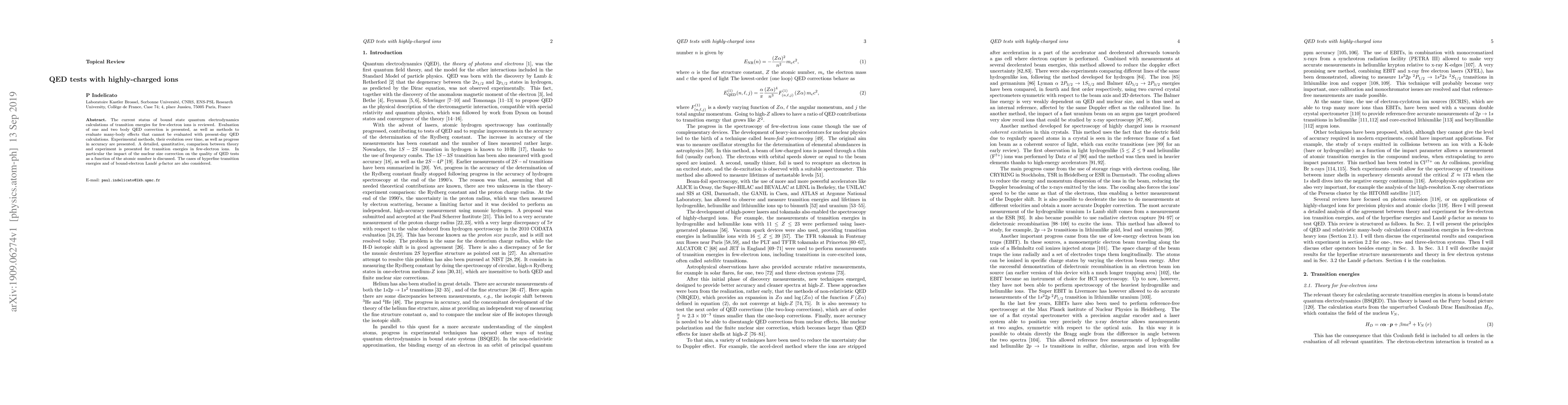 This paper reviews advanced QED calculations for transition energies in few-electron ions, comparing theoretical predictions with experimental results, and discusses the impact of nuclear size corrections on QED tests, especially for hyperfine transitions and bound-electron Landé $g$-factors. It also examines the evolution and accuracy of experimental methods over time.