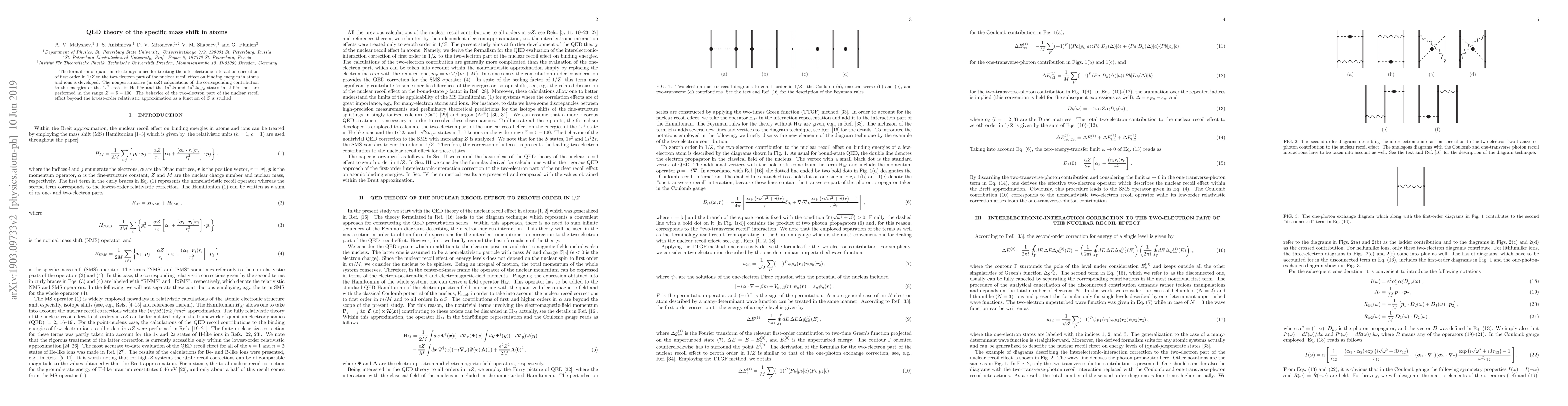 The quantum electrodynamics formalism to treat the interelectronic-interaction correction of first order in $1/Z$ to the two-electron part of the nuclear recoil effect on binding energies in atoms and ions is developed. The nonperturbative in $\alpha Z$ calculations of the corresponding contribution to the energies of the $1s^2$ state in He-like and the $1s^2 2s$ and $1s^2 2p_{1/2}$ states in Li-like ions are performed in the range $Z=5-100$. The behavior of the two-electron part of the nuclear recoil effect beyond the lowest-order relativistic approximation as $Z$ grows is studied.