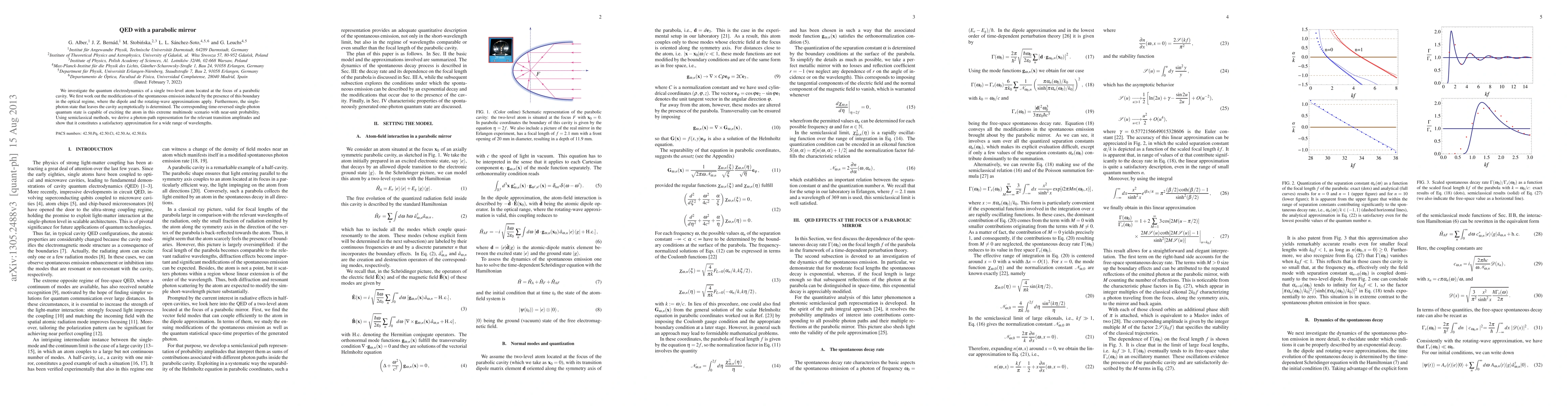 We investigate the quantum electrodynamics of a single two-level atom located at the focus of a parabolic cavity. We first work out the modifications of the spontaneous emission induced by the presence of this boundary in the optical regime, where the dipole and the rotating-wave approximations apply. Furthermore, the single-photon state that leaves the cavity asymptotically is determined. The corresponding time-reversed single-photon quantum state is capable of exciting the atom in this extreme multimode scenario with near-unit probability. Using semiclassical methods, we derive a photon-path representation for the relevant transition amplitudes and show that it constitutes a satisfactory approximation for a wide range of wavelengths.