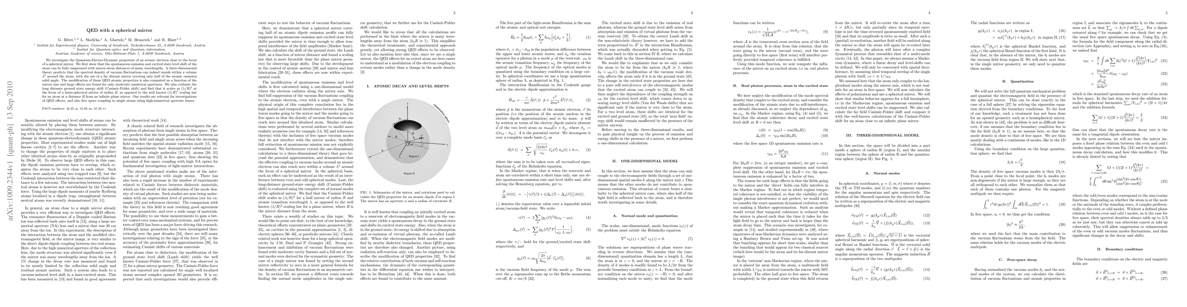 We investigate the Quantum-Electro-Dynamic properties of an atomic electron close to the focus of a spherical mirror. We first show that the spontaneous emission and excited state level shift of the atom can be fully suppressed with mirror-atom distances of many wavelengths. A three-dimensional theory predicts that the spectral density of vacuum fluctuations can indeed vanish within a volume $\lambda^3$ around the atom, with the use of a far distant mirror covering only half of the atomic emission solid angle. The modification of these QED atomic properties is also computed as a function of the mirror size and large effects are found for only moderate numerical apertures. We also evaluate the long distance ground state energy shift (Casimir-Polder shift) and find that it scales as $(\lambda/R)^2$ at the focus of a hemi-spherical mirror of radius $R$, as opposed to the well known $(\lambda/R)^4$ scaling law for an atom at a distance $R$ from an infinite plane mirror. Our results are relevant for investigations of QED effects, and also free space coupling to single atoms using high-numerical aperture lenses.