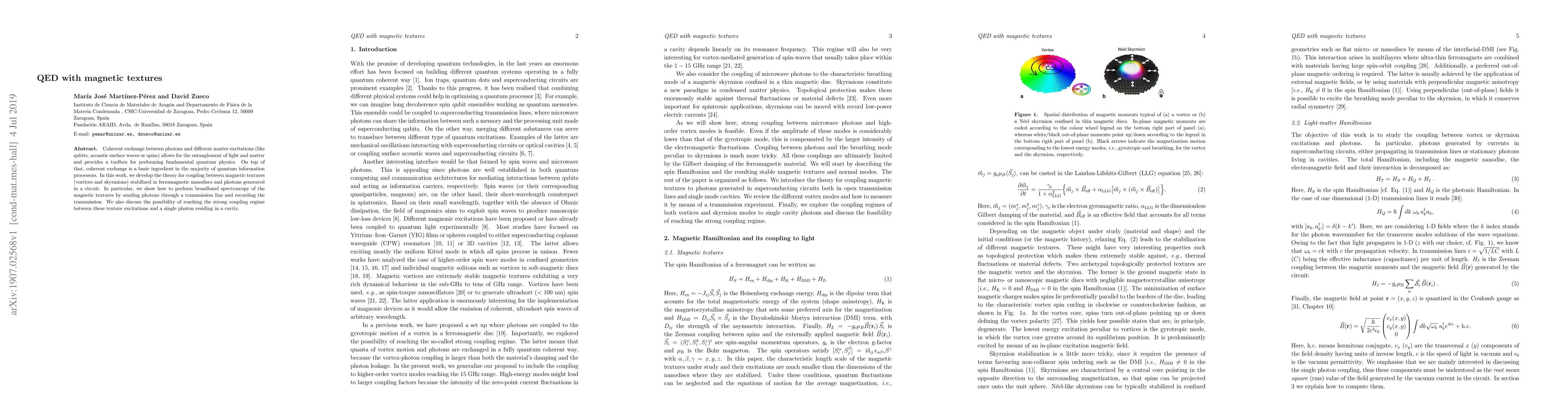 Coherent exchange between photons and different matter excitations (like qubits, acoustic surface waves or spins) allows for the entanglement of light and matter and provides a toolbox for performing fundamental quantum physics. On top of that, coherent exchange is a basic ingredient in the majority of quantum information processors. In this work, we develop the theory for coupling between magnetic textures (vortices and skyrmions) stabilized in ferromagnetic nanodiscs and photons generated in a circuit. In particular, we show how to perform broadband spectroscopy of the magnetic textures by sending photons through a transmission line and recording the transmission. We also discuss the possibility of reaching the strong coupling regime between these texture excitations and a single photon residing in a cavity.