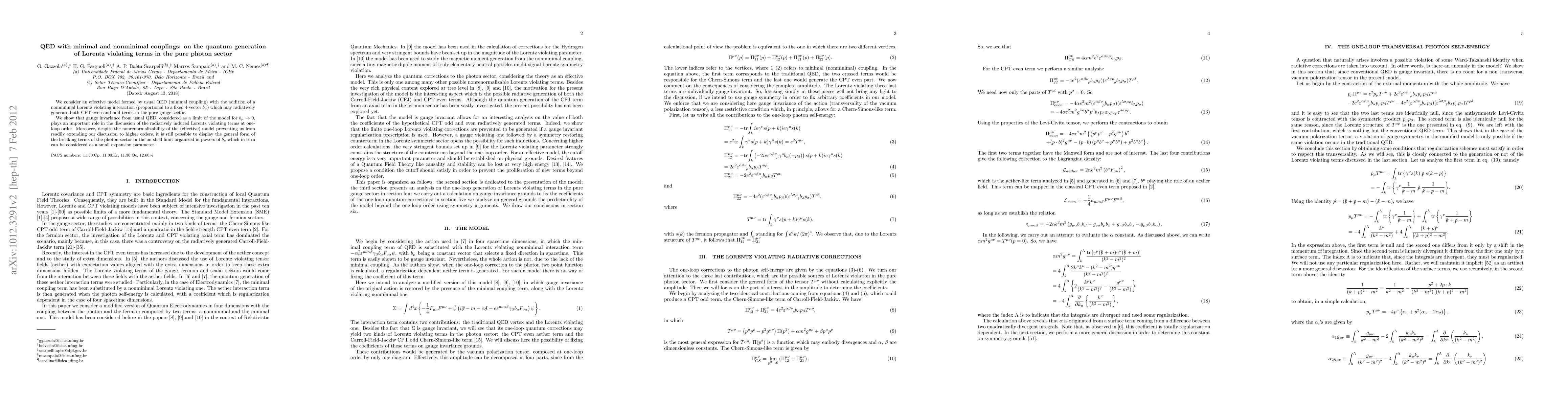 This paper explores an effective model combining standard QED with a nonminimal Lorentz-violating interaction, demonstrating how radiative corrections can generate both CPT-even and CPT-odd terms in the photon sector. It highlights the crucial role of gauge invariance in understanding the one-loop order effects, despite the model's nonrenormalizability.