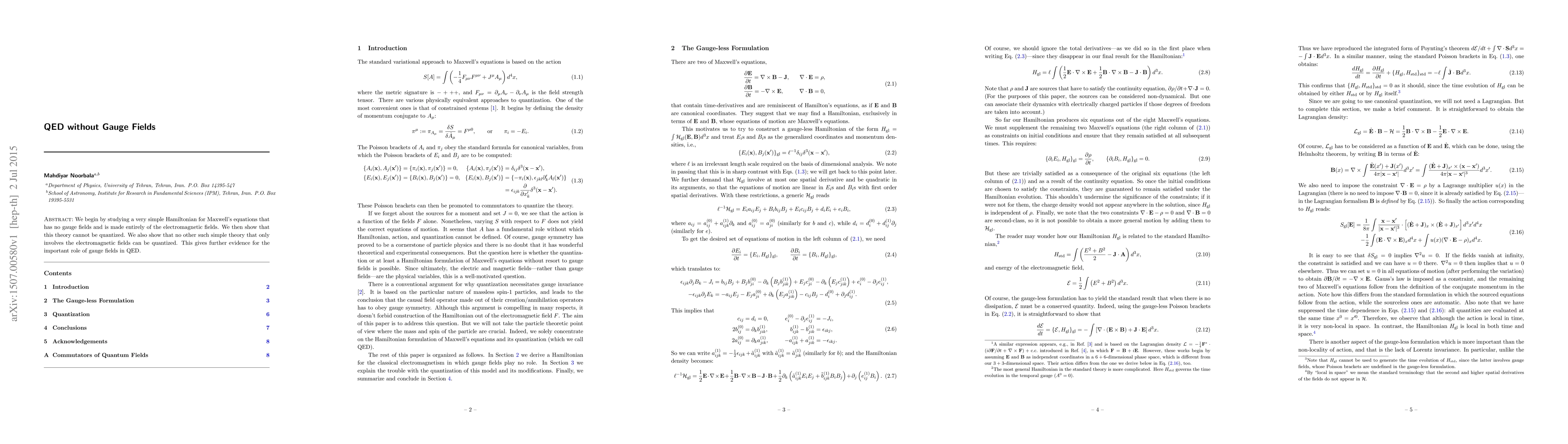 We begin by studying a very simple Hamiltonian for Maxwell's equations that has no gauge fields and is made entirely of the electromagnetic fields. We then show that this theory cannot be quantized. We also show that no other such simple theory that only involves the electromagnetic fields can be quantized. This gives further evidence for the important role of gauge fields in QED.