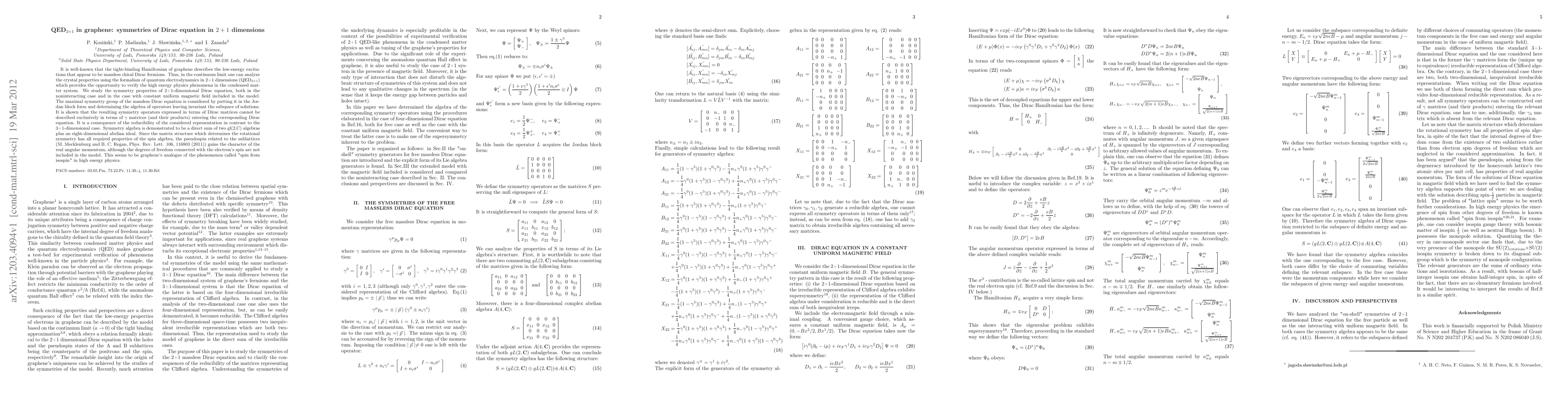 This paper investigates the symmetry properties of the 2+1-dimensional Dirac equation in graphene, revealing a maximal symmetry group that includes a direct sum of two gl(2,C) algebras and an eight-dimensional abelian ideal. The study finds that the pseudospin in graphene exhibits characteristics akin to angular momentum, akin to the "spin from isospin" phenomenon in high-energy physics.