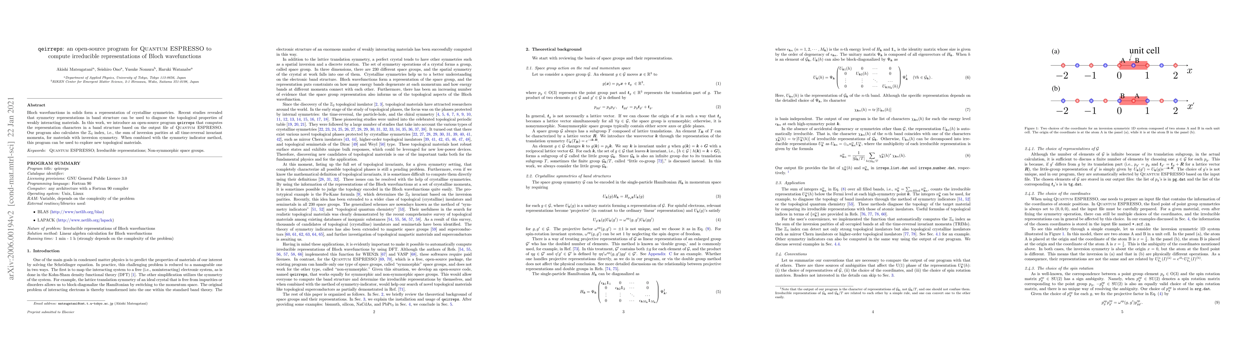 This paper introduces qeirreps, an open-source program for computing irreducible representations of Bloch wavefunctions from Quantum ESPRESSO output, aiding in the diagnosis of topological properties in materials. It also calculates the Z4 index for materials with inversion symmetry, enhancing the identification of new topological materials.
