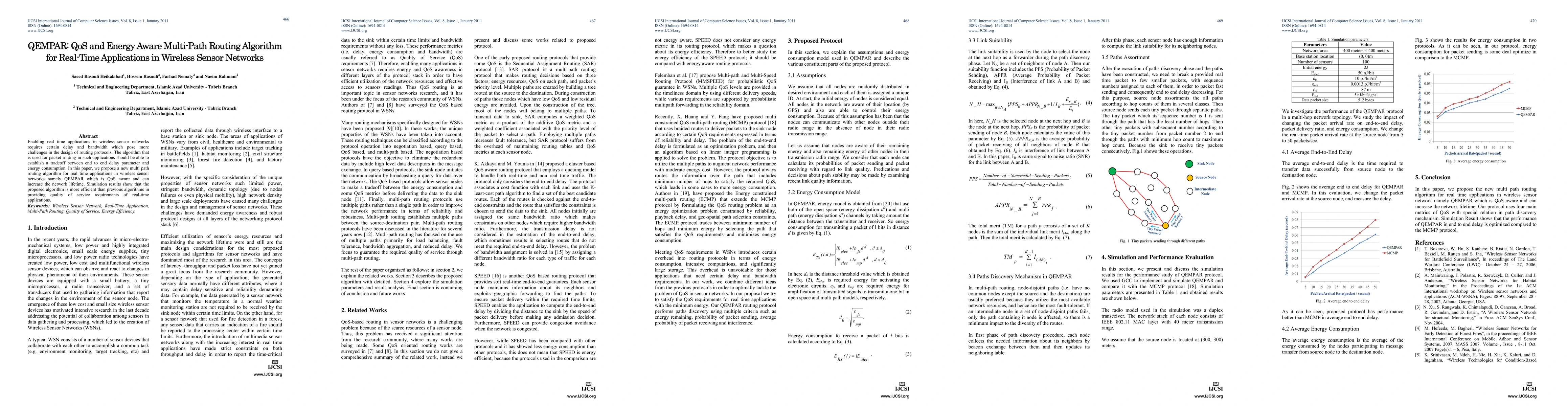Title: QEMPAR: QoS and Energy Aware Multi-Path Routing Algorithm for Real-Time Applications in Wireless Sensor Networks Summary: This paper proposes QEMPAR, a QoS-aware multi-path routing algorithm that optimizes both delay and energy consumption for real-time applications in wireless sensor networks, demonstrating improved efficiency over existing algorithms through simulations.