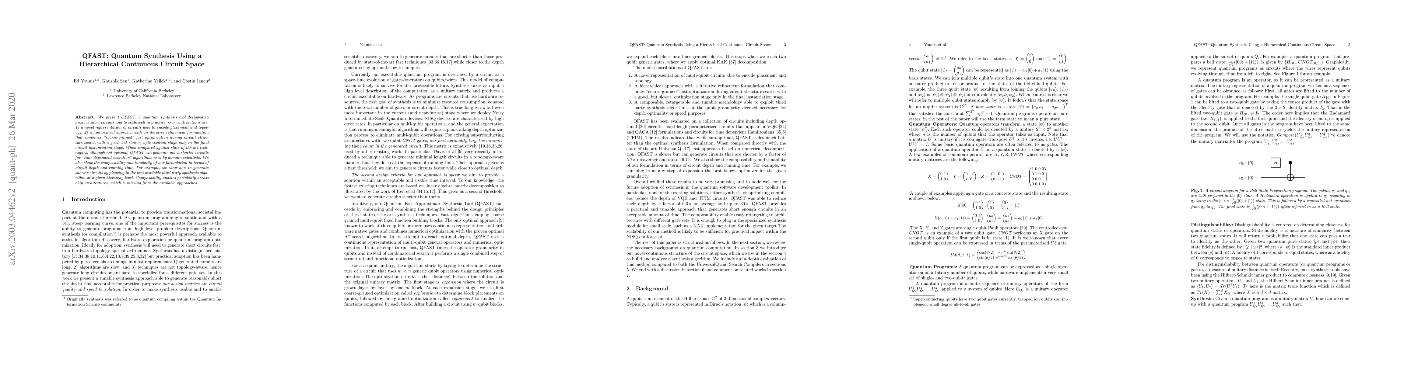 QFAST is a quantum synthesis tool that generates short, scalable circuits using a hierarchical continuous circuit space approach, combining fast optimization with iterative refinement for efficient circuit structure search and final instantiation. It demonstrates superior circuit length for time-dependent evolution algorithms compared to state-of-the-art techniques and offers composability for portability across different chip architectures.