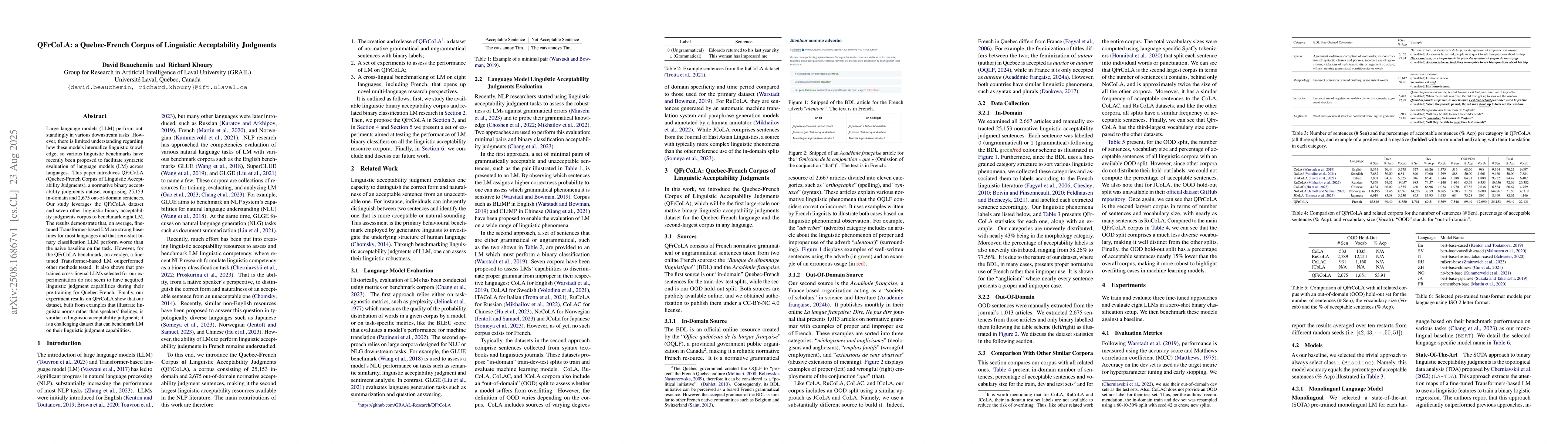 Large and Transformer-based language models perform outstandingly in various downstream tasks. However, there is limited understanding regarding how these models internalize linguistic knowledge, so various linguistic benchmarks have recently been proposed to facilitate syntactic evaluation of language models across languages. This paper introduces QFrCoLA (Quebec-French Corpus of Linguistic Acceptability Judgments), a normative binary acceptability judgments dataset comprising 25,153 in-domain and 2,675 out-of-domain sentences. Our study leverages the QFrCoLA dataset and seven other linguistic binary acceptability judgment corpora to benchmark seven language models. The results demonstrate that, on average, fine-tuned Transformer-based LM are strong baselines for most languages and that zero-shot binary classification large language models perform poorly on the task. However, for the QFrCoLA benchmark, on average, a fine-tuned Transformer-based LM outperformed other methods tested. It also shows that pre-trained cross-lingual LLMs selected for our experimentation do not seem to have acquired linguistic judgment capabilities during their pre-training for Quebec French. Finally, our experiment results on QFrCoLA show that our dataset, built from examples that illustrate linguistic norms rather than speakers' feelings, is similar to linguistic acceptability judgment; it is a challenging dataset that can benchmark LM on their linguistic judgment capabilities.