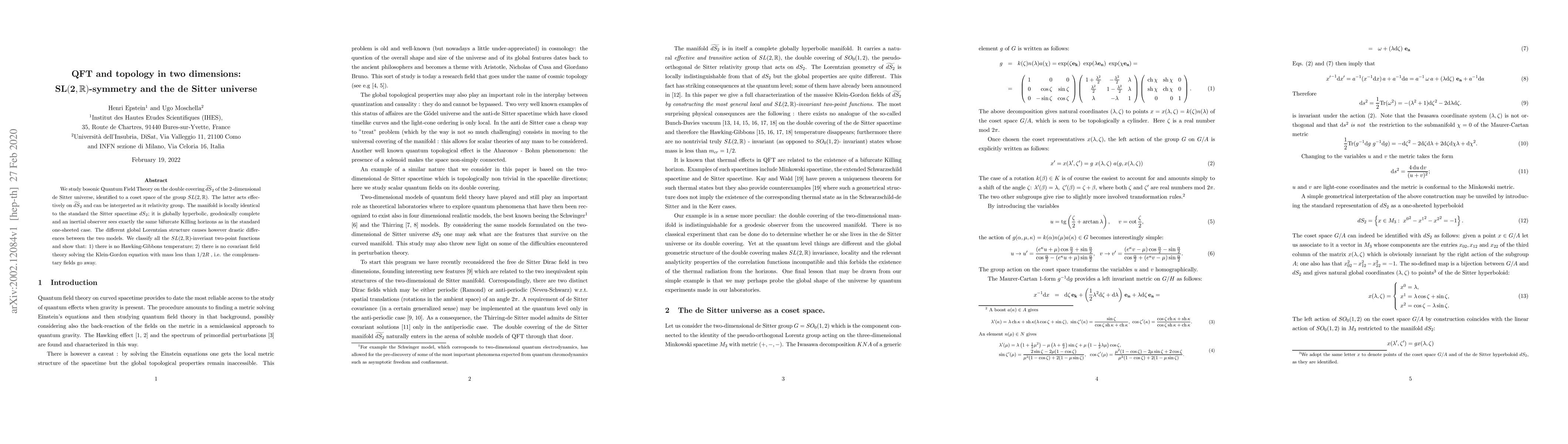 This paper investigates Quantum Field Theory on the double-covering of a 2-dimensional de Sitter universe, revealing that the $SL(2,{\Bbb R})$-symmetry leads to no Hawking-Gibbons temperature and excludes covariant field theories for massless Klein-Gordon fields with mass less than $1/2R$.