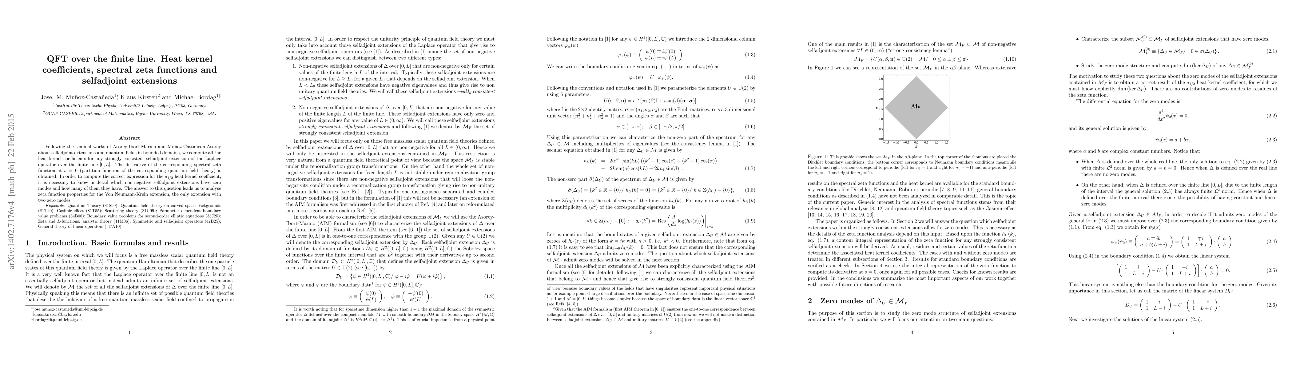 Following the seminal works of Asorey-Ibort-Marmo and Mu\~{n}oz-Casta\~{n}eda-Asorey about selfadjoint extensions and quantum fields in bounded domains, we compute all the heat kernel coefficients for any strongly consistent selfadjoint extension of the Laplace operator over the finite line $[0,L]$. The derivative of the corresponding spectral zeta function at $s=0$ (partition function of the corresponding quantum field theory) is obtained. In order to compute the correct expression for the $a_{1/2}$ heat kernel coefficient, it is necessary to know in detail which non-negative selfadjoint extensions have zero modes and how many of them they have. The answer to this question leads us to analyse zeta function properties for the Von Neumann-Krein extension, the only extension with two zero modes.