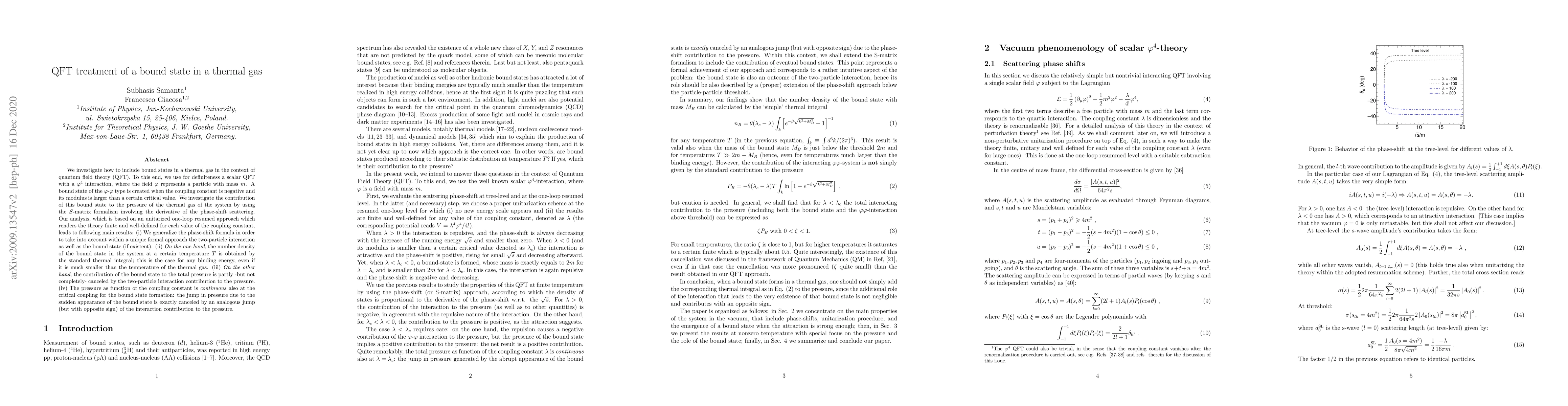 We investigate how to include bound states in a thermal gas in the context of quantum field theory (QFT). To this end, we use for definiteness a scalar QFT with a $\varphi^{4}$ interaction, where the field $\varphi$ represents a particle with mass $m$. A bound state of the $\varphi$-$\varphi$ type is created when the coupling constant is negative and its modulus is larger than a certain critical value. We investigate the contribution of this bound state to the pressure of the thermal gas of the system by using the $S$-matrix formalism involving the derivative of the phase-shift scattering. Our analysis, which is based on an unitarized one-loop resumed approach which renders the theory finite and well-defined for each value of the coupling constant, leads to following main results: (i) We generalize the phase-shift formula in order to take into account within a unique formal approach the two-particle interaction as well as the bound state (if existent). (ii) \textit{On the one hand}, the number density of the bound state in the system at a certain temperature $T$ is obtained by the standard thermal integral; this is the case for any binding energy, even if it is much smaller than the temperature of the thermal gas. (iii) \textit{On the other hand}, the contribution of the bound state to the total pressure is partly -- but not completely -- canceled by the two-particle interaction contribution to the pressure. (iv) The pressure as function of the coupling constant is \textit{continuous} also at the critical coupling for the bound state formation: the jump in pressure due to the sudden appearance of the bound state is exactly canceled by an analogous jump (but with opposite sign) of the interaction contribution to the pressure.