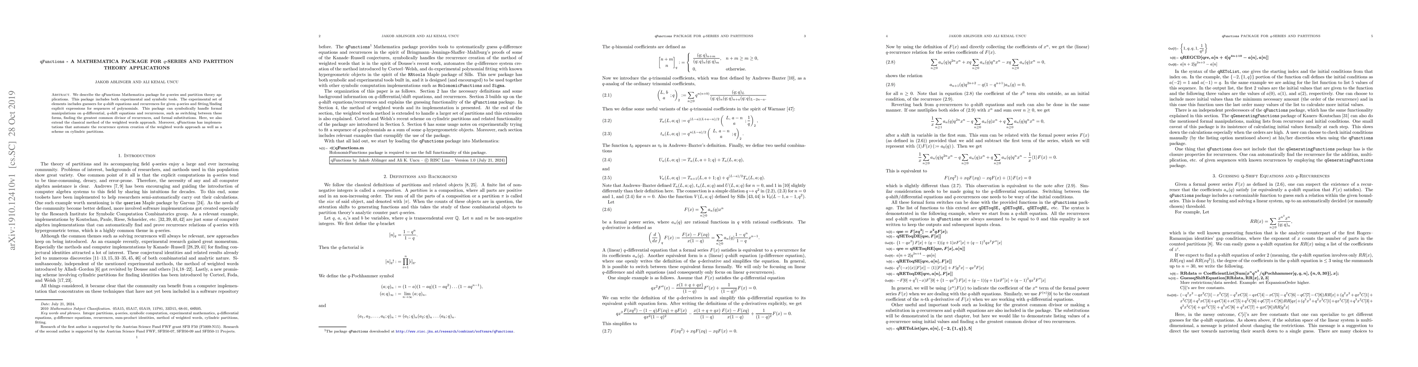 Summary: The qFunctions package for Mathematica provides tools for $q$-series and partition theory, including experimental guessers for $q$-shift equations and symbolic manipulations for $q$-differential and shift equations, along with automated systems for recurrence and cylindric partition creation.