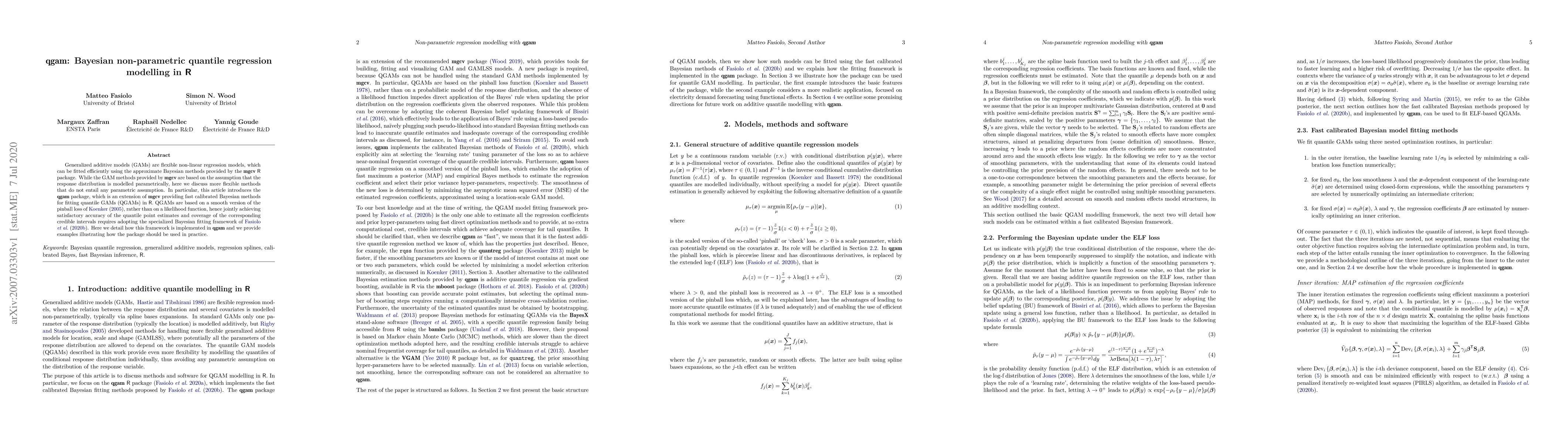 The qgam R package extends mgcv to provide Bayesian non-parametric quantile regression modelling through quantile GAMs. It utilizes a specialized Bayesian fitting framework to achieve accurate quantile estimates and credible intervals without parametric assumptions.