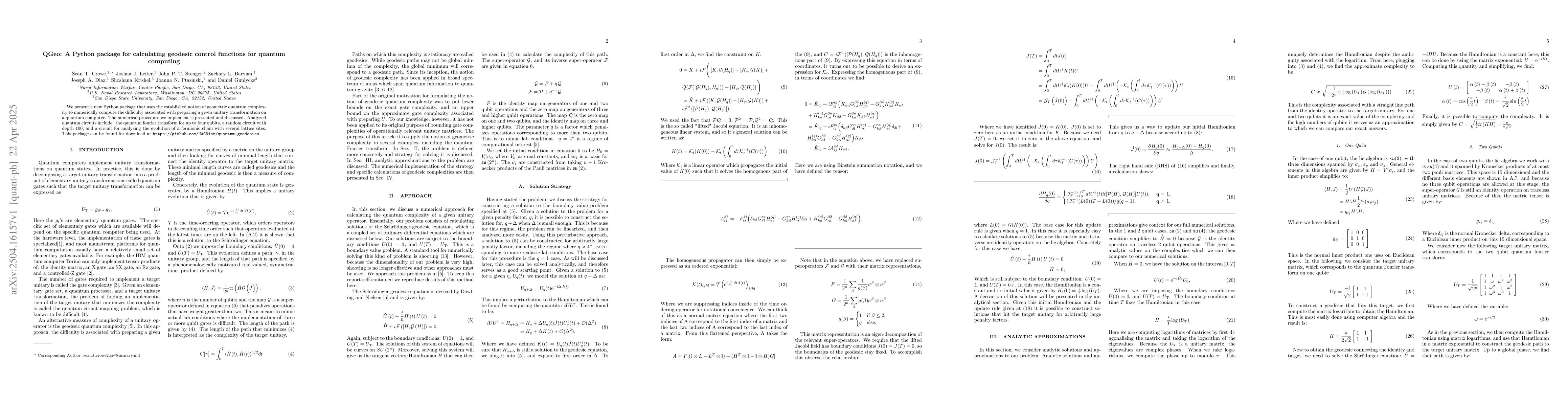 The paper presents a Python package, QGeo, for calculating geodesic control functions for quantum computing using geometric quantum complexity. It employs numerical procedures to compute the difficulty of preparing a given unitary transformation on a quantum computer, analyzing circuits like the quantum Fourier transform, a random circuit, and a fermionic chain evolution.