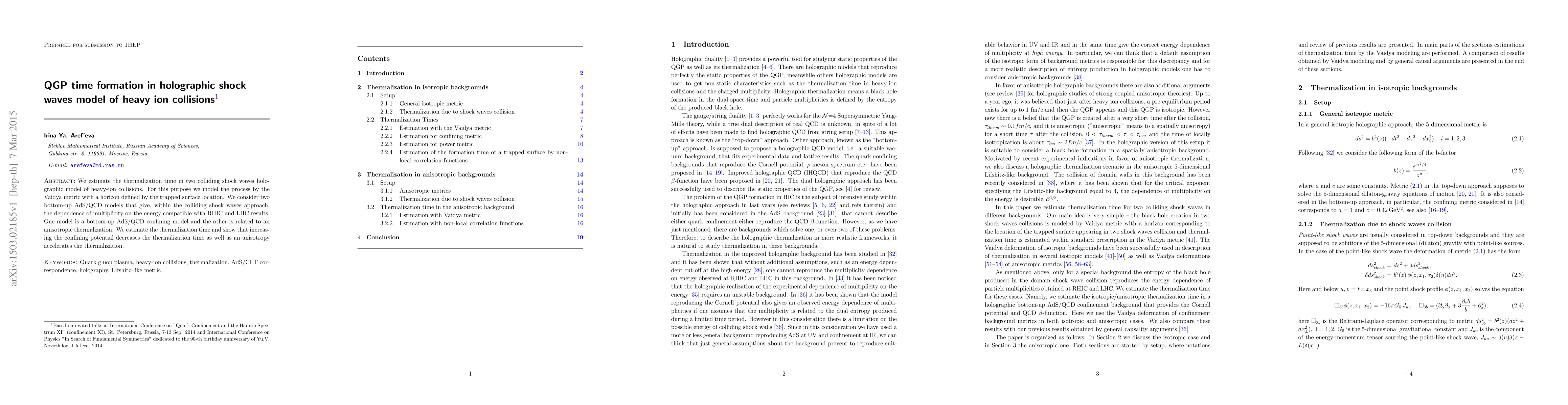 Researchers investigated thermalization times in heavy-ion collisions using a holographic shock waves model, finding that increasing confining potential decreases thermalization time and anisotropy accelerates it.