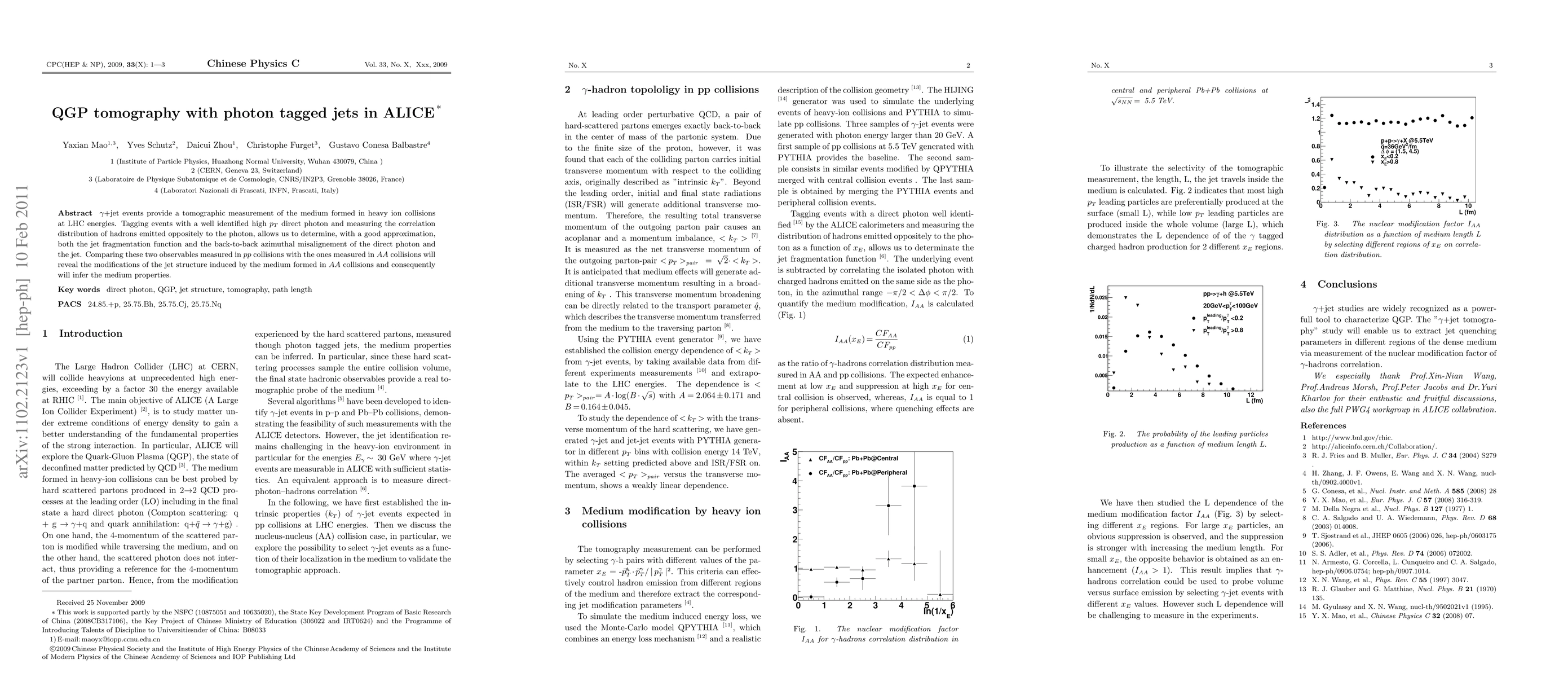 $\gamma +$jet events provide a tomographic measurement of the medium formed in heavy ion collisions at LHC energies. Tagging events with a well identified high $p_{T}$ direct photon and measuring the correlation distribution of hadrons emitted oppositely to the photon, allows us to determine, with a good approximation, both the jet fragmentation function and the back-to-back azimuthal misalignement of the direct photon and the jet. Comparing these two observables measured in $pp$ collisions with the ones measured in $AA$ collisions will reveal the modifications of the jet structure induced by the medium formed in $AA$ collisions and consequently will infer the medium properties.