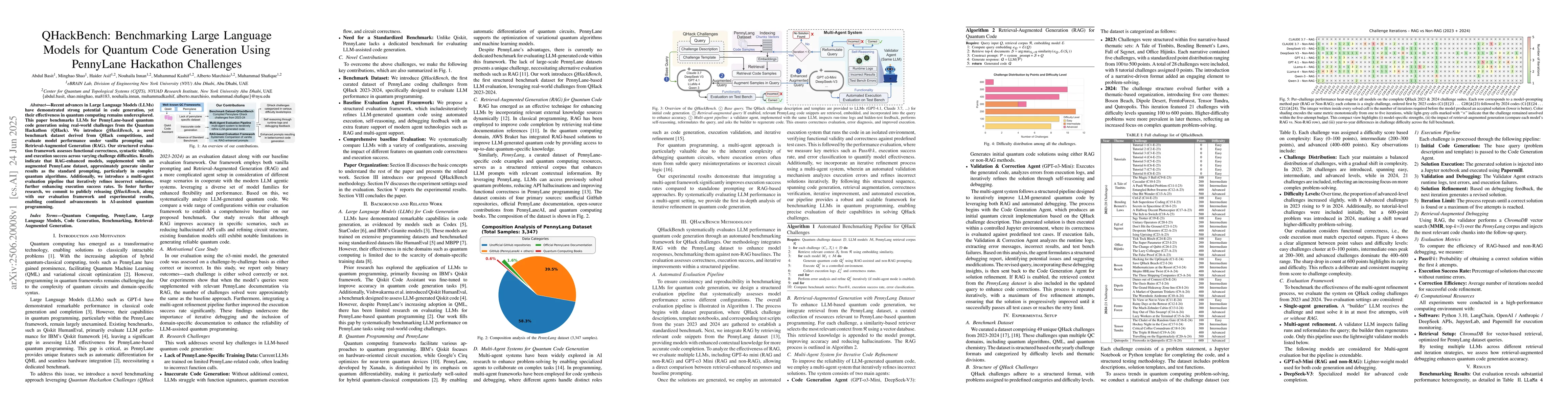Recent advances in Large Language Models (LLMs) have demonstrated strong potential in code generation, yet their effectiveness in quantum computing remains underexplored. This paper benchmarks LLMs for PennyLane-based quantum code generation using real-world challenges from the Quantum Hackathon (QHack). We introduce QHackBench, a novel benchmark dataset derived from QHack competitions, and evaluate model performance under vanilla prompting and Retrieval-Augmented Generation (RAG). Our structured evaluation framework assesses functional correctness, syntactic validity, and execution success across varying challenge difficulties. Results indicate that RAG-enhanced models, supplemented with an augmented PennyLane dataset, approximately generate similar results as the standard prompting, particularly in complex quantum algorithms. Additionally, we introduce a multi-agent evaluation pipeline that iteratively refines incorrect solutions, further enhancing execution success rates. To foster further research, we commit to publicly releasing QHackBench, along with our evaluation framework and experimental results, enabling continued advancements in AI-assisted quantum programming.