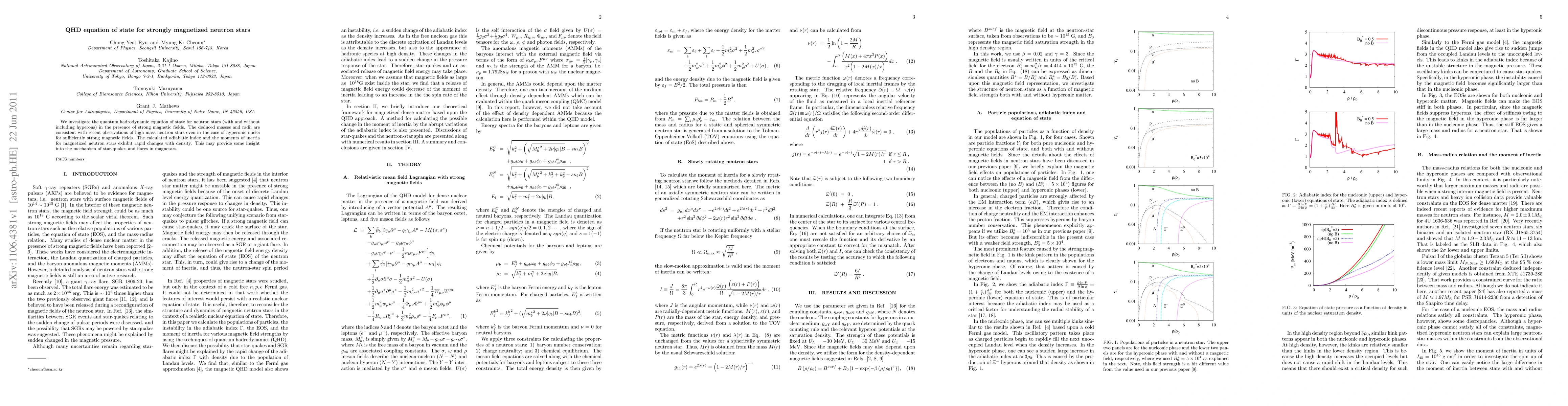 This study examines the quantum hadrodynamic equation of state for neutron stars, including hyperons, under strong magnetic fields, revealing consistent masses and radii with recent observations. The research also highlights significant changes in the adiabatic index and moments of inertia, potentially shedding light on star-quakes and flares in magnetars.