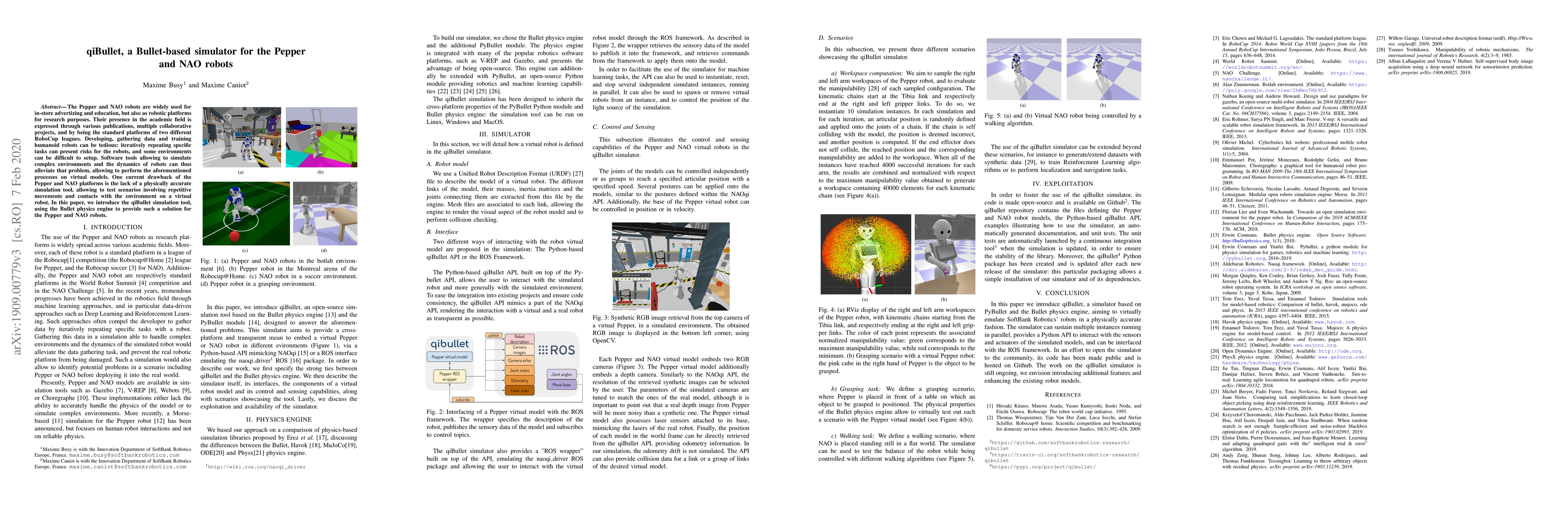 The Pepper and NAO robots are widely used for in-store advertizing and education, but also as robotic platforms for research purposes. Their presence in the academic field is expressed through various publications, multiple collaborative projects, and by being the standard platforms of two different RoboCup leagues. Developing, gathering data and training humanoid robots can be tedious: iteratively repeating specific tasks can present risks for the robots, and some environments can be difficult to setup. Software tools allowing to simulate complex environments and the dynamics of robots can thus alleviate that problem, allowing to perform the aforementioned processes on virtual models. One current drawback of the Pepper and NAO platforms is the lack of a physically accurate simulation tool, allowing to test scenarios involving repetitive movements and contacts with the environment on a virtual robot. In this paper, we introduce the qiBullet simulation tool, using the Bullet physics engine to provide such a solution for the Pepper and NAO robots.