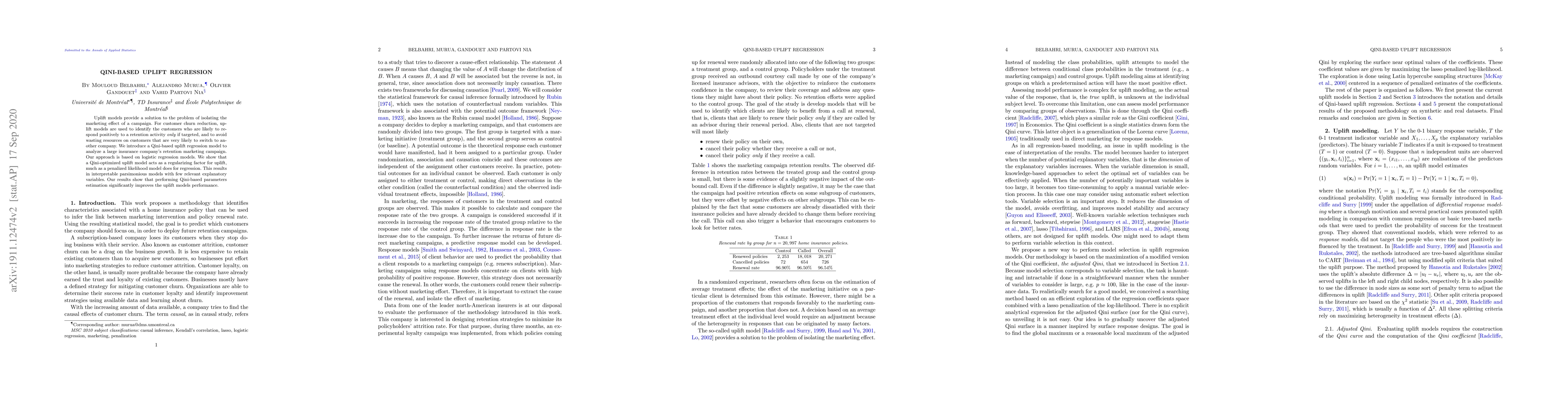 This paper introduces a Qini-based uplift regression model for analyzing retention marketing campaigns, demonstrating improved performance over traditional methods by using logistic regression and a regularization factor. The approach identifies customers likely to respond positively to retention efforts, enhancing efficiency and resource allocation.
