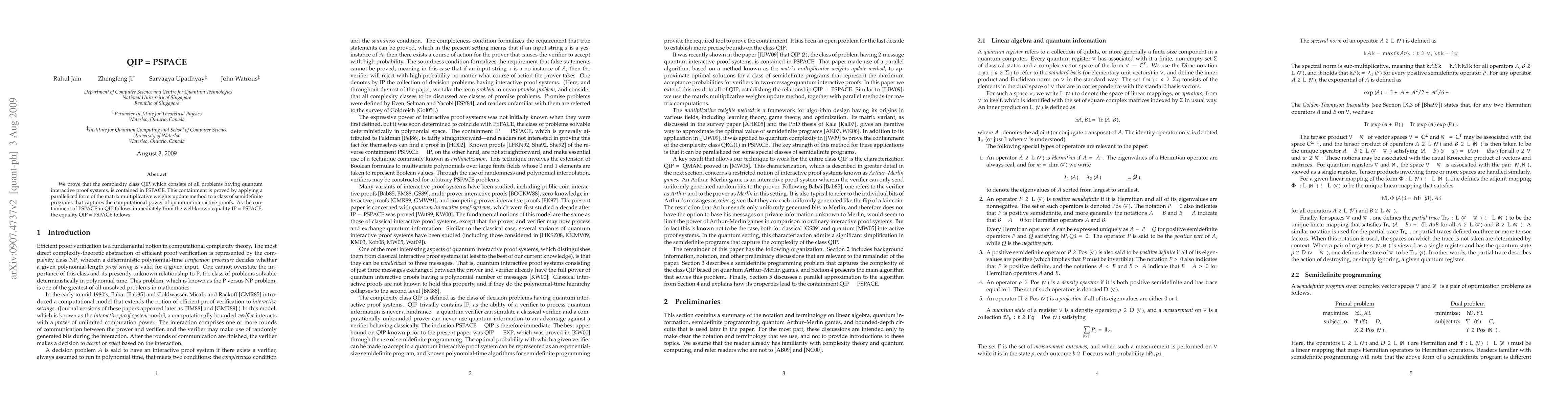The paper proves that the complexity class QIP, which involves quantum interactive proof systems, is contained within PSPACE. This conclusion is reached by using a parallelized matrix multiplicative weights update method applied to semidefinite programs.