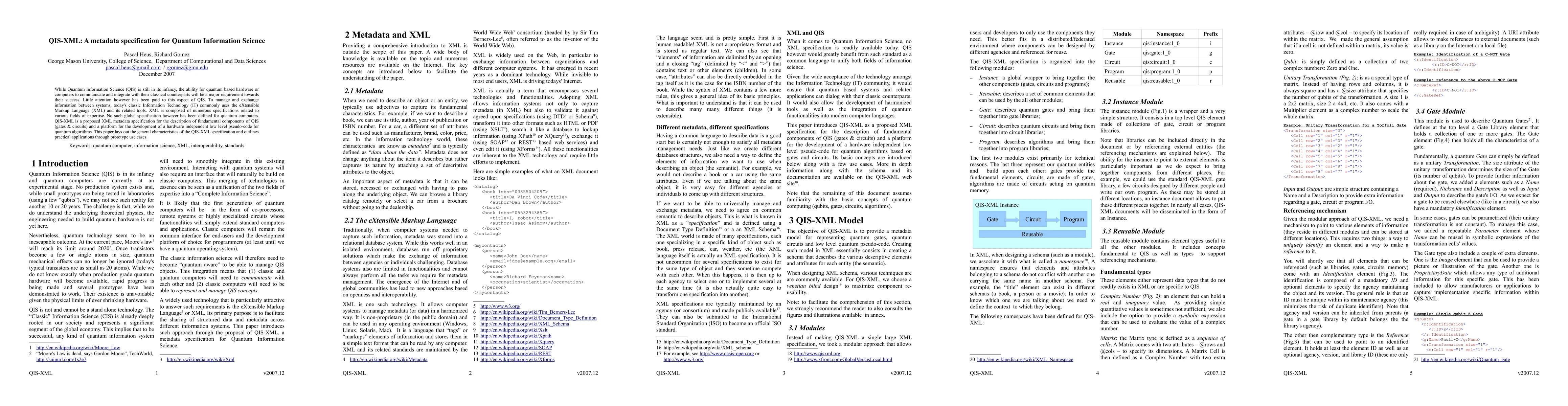While Quantum Information Science (QIS) is still in its infancy, the ability for quantum based hardware or computers to communicate and integrate with their classical counterparts will be a major requirement towards their success. Little attention however has been paid to this aspect of QIS. To manage and exchange information between systems, today's classic Information Technology (IT) commonly uses the eXtensible Markup Language (XML) and its related tools. XML is composed of numerous specifications related to various fields of expertise. No such global specification however has been defined for quantum computers. QIS-XML is a proposed XML metadata specification for the description of fundamental components of QIS (gates & circuits) and a platform for the development of a hardware independent low level pseudo-code for quantum algorithms. This paper lays out the general characteristics of the QIS-XML specification and outlines practical applications through prototype use cases.