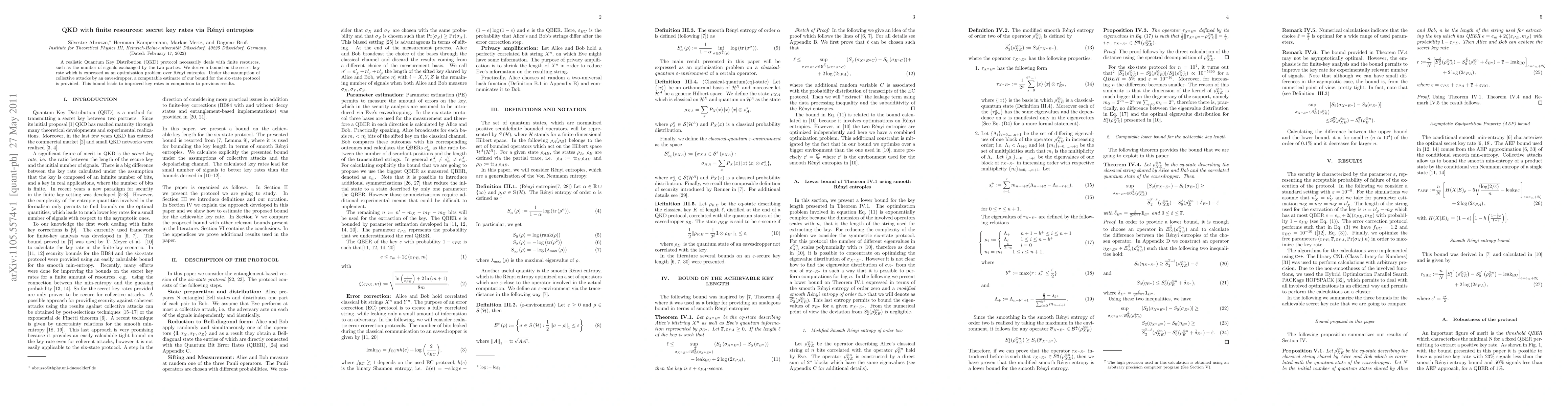 A realistic Quantum Key Distribution (QKD) protocol necessarily deals with finite resources, such as the number of signals exchanged by the two parties. We derive a bound on the secret key rate which is expressed as an optimization problem over R\'enyi entropies. Under the assumption of collective attacks by an eavesdropper, a computable estimate of our bound for the six-state protocol is provided. This bound leads to improved key rates in comparison to previous results.