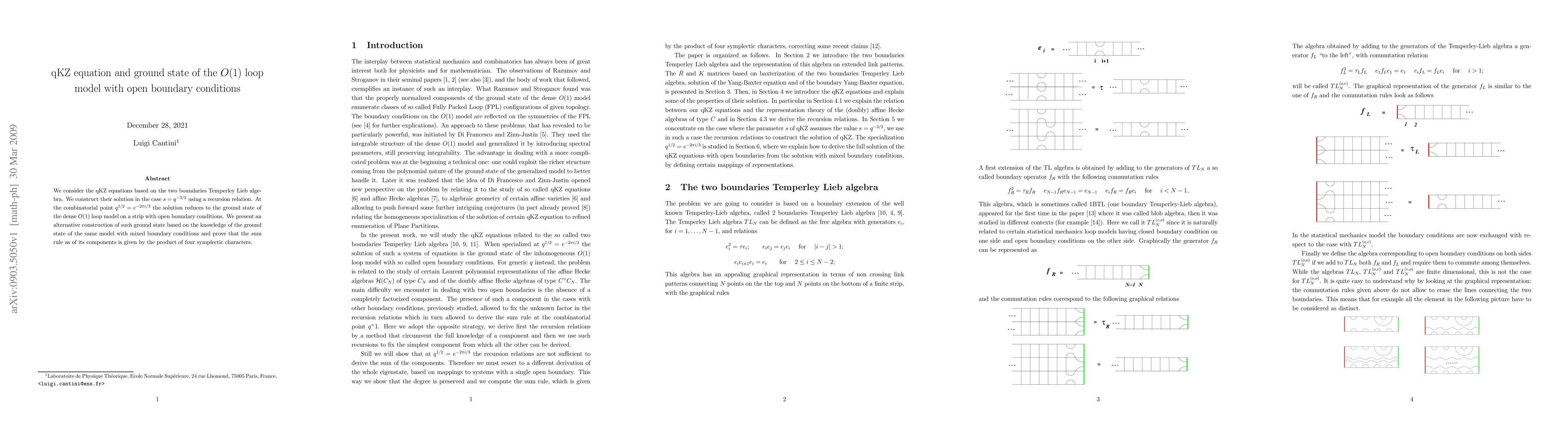 We consider the qKZ equations based on the two boundaries Temperley Lieb algebra. We construct their solution in the case $s=q^{-3/2}$ using a recursion relation. At the combinatorial point $q^{1/2}= e^{-2\pi i/3}$ the solution reduces to the ground state of the dense O(1) loop model on a strip with open boundary conditions. We present an alternative construction of such ground state based on the knowledge of the ground state of the same model with mixed boundary conditions and prove that the sum rule as of its components is given by the product of four symplectic characters.