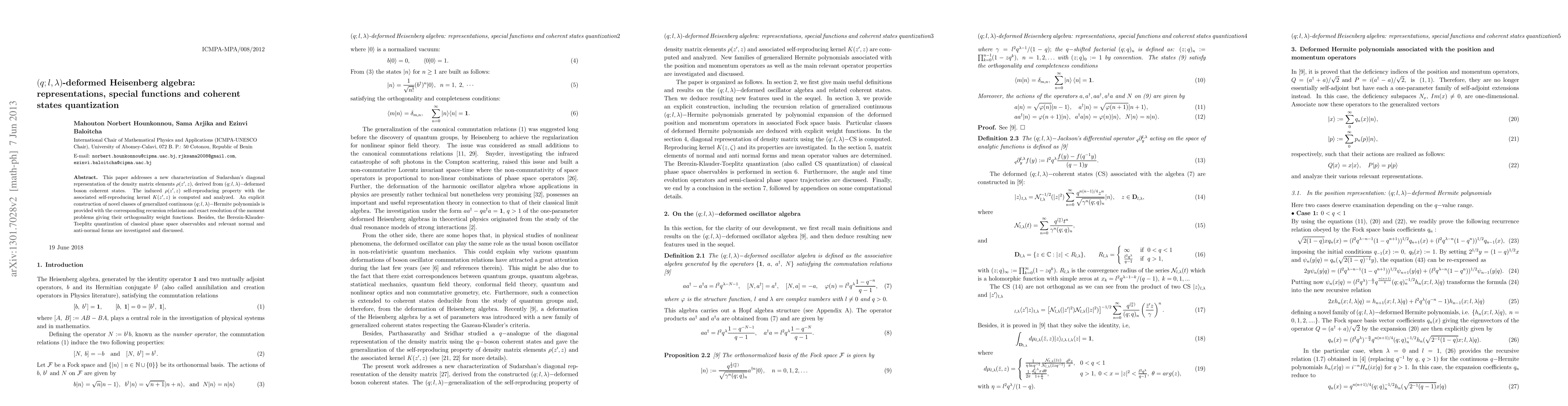 This paper addresses a new characterization of Sudarshan's diagonal representation of the density matrix elements $\rho(z',z)$, derivedfrom $(q;l,\lambda)-$deformed boson coherent states.The induced $\rho(z',z)$ self-reproducing property with the associated self-reproducing kernel $K(z',z)$ is computed and analyzed. An explicit construction of novel classes of generalized continuous $(q;l,\lambda)-$Hermite polynomials is provided with the corresponding recursion relations and exact resolution of the moment problems giving their orthogonality weight functions. Besides, the Berezin-Klauder-Toeplitz quantization of classical phase space observables and relevant normal and anti-normal forms are investigated and discussed.