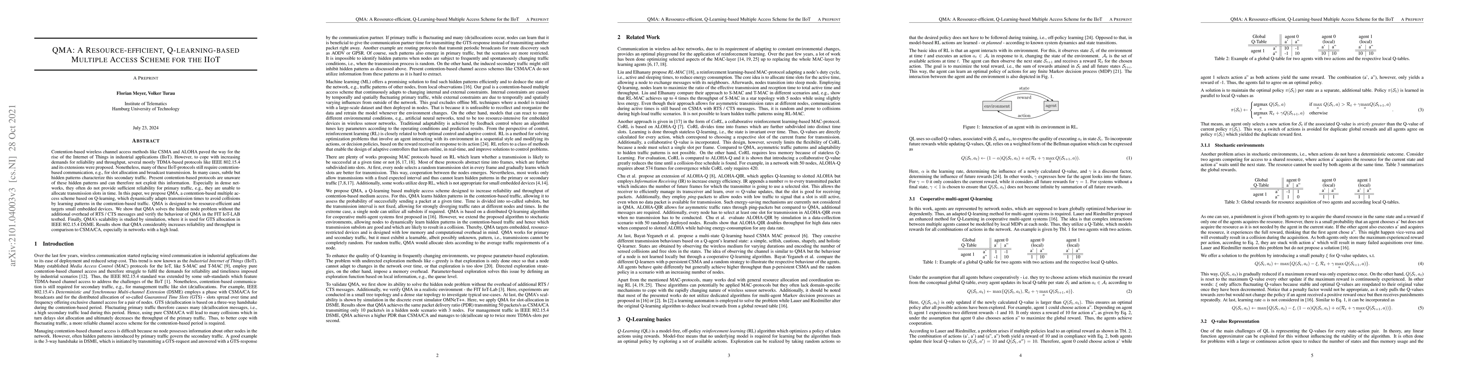 Contention-based wireless channel access methods like CSMA and ALOHA paved the way for the rise of the Internet of Things in industrial applications (IIoT). However, to cope with increasing demands for reliability and throughput, several mostly TDMA-based protocols like IEEE 802.15.4 and its extensions were proposed. Nonetheless, many of these IIoT-protocols still require contention-based communication, e.g., for slot allocation and broadcast transmission. In many cases, subtle but hidden patterns characterize this secondary traffic. Present contention-based protocols are unaware of these hidden patterns and can therefore not exploit this information. Especially in dense networks, they often do not provide sufficient reliability for primary traffic, e.g., they are unable to allocate transmission slots in time. In this paper, we propose QMA, a contention-based multiple access scheme based on Q-learning, which dynamically adapts transmission times to avoid collisions by learning patterns in the contention-based traffic. QMA is designed to be resource-efficient and targets small embedded devices. We show that QMA solves the hidden node problem without the additional overhead of RTS / CTS messages and verify the behaviour of QMA in the FIT IoT-LAB testbed. Finally, QMA's scalability is studied by simulation, where it is used for GTS allocation in IEEE 802.15.4 DSME. Results show that QMA considerably increases reliability and throughput in comparison to CSMA/CA, especially in networks with a high load.