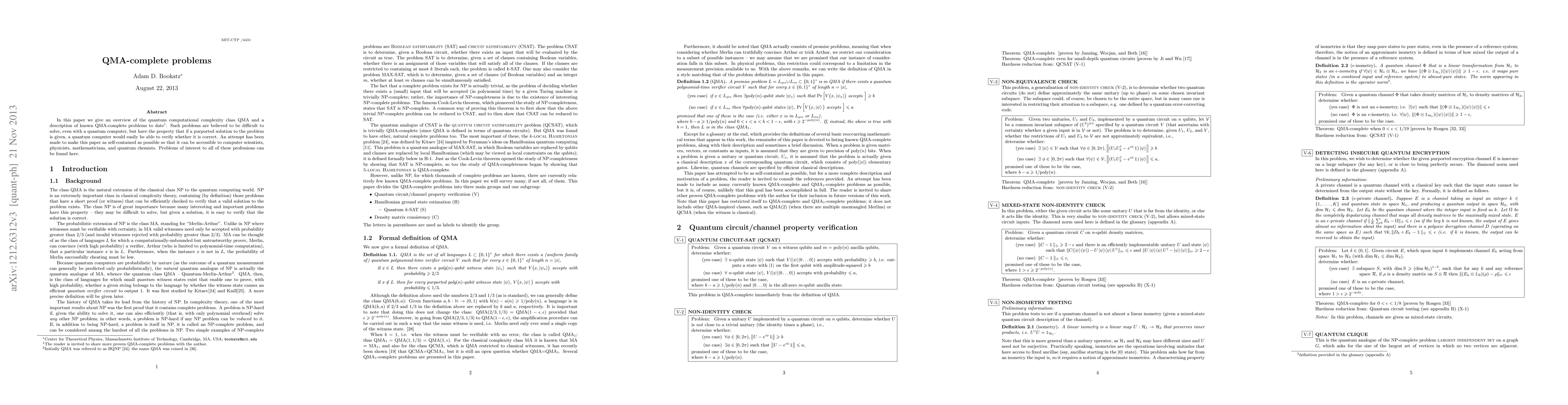 This paper provides an overview of the quantum computational complexity class QMA and details known QMA-complete problems, believed to be hard to solve but easily verifiable by quantum computers. The paper aims to be accessible to a broad audience, including computer scientists, physicists, mathematicians, and quantum chemists.