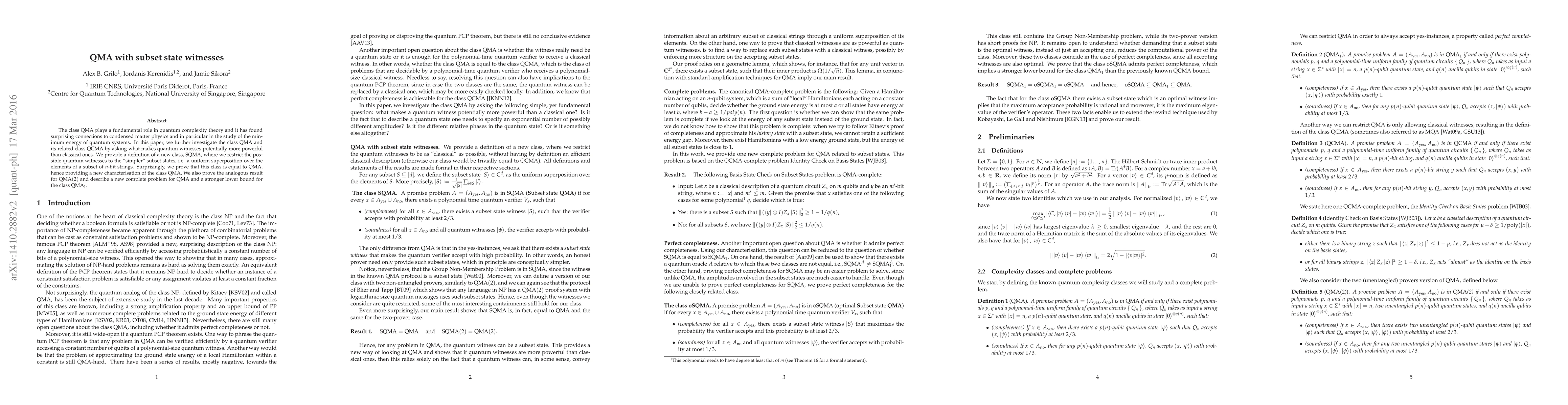 The paper investigates the class QMA in quantum complexity theory, defining a new class SQMA that restricts quantum witnesses to subset states. It proves SQMA equals QMA, and extends similar results to QMA(2).