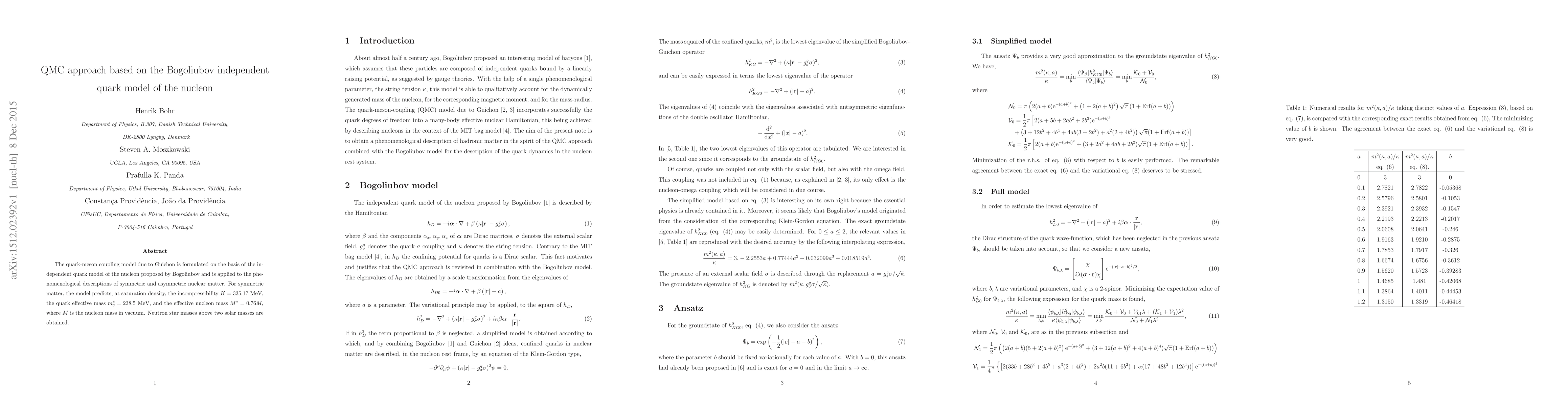 This paper applies the quark-meson coupling model based on Bogoliubov's independent quark model to describe symmetric and asymmetric nuclear matter, predicting an incompressibility of $K=335.17$ MeV and neutron star masses exceeding two solar masses.