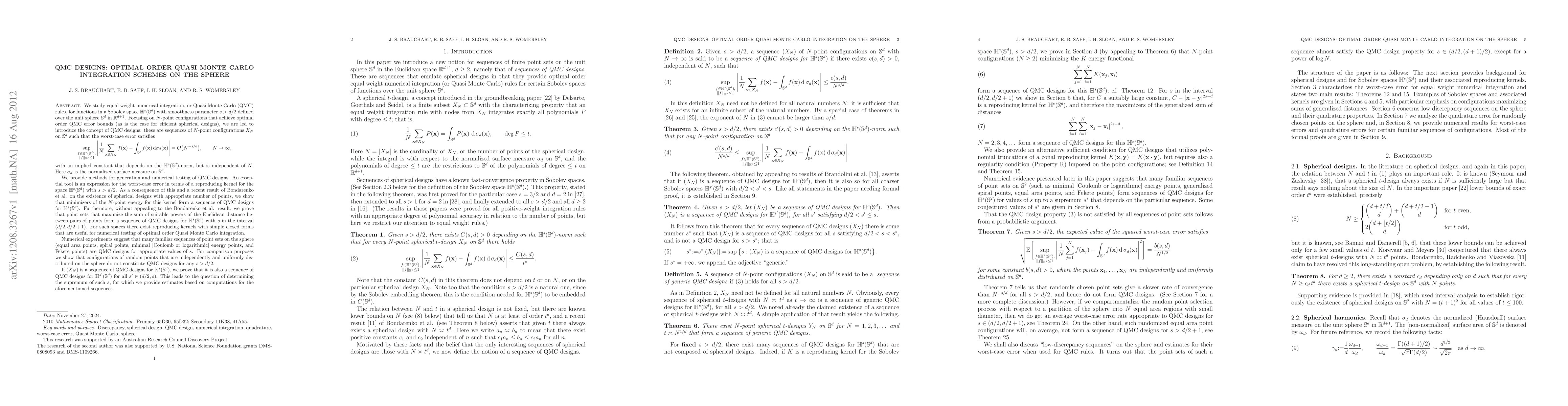 We study equal weight numerical integration, or Quasi Monte Carlo (QMC) rules, for functions in a Sobolev space $H^s(S^d)$ with smoothness parameter $s>d/2$ defined over the unit sphere $S^d$ in $R^{d+1}$. Focusing on $N$-point sets that achieve optimal order QMC error bounds (as is the case for efficient spherical designs), we are led to introduce the concept of QMC designs: these are sequences of $N$-point node sets $X_N$ on $S^d$ such that the worst-case error of the corresponding QMC rules satisfy a bound of order $O(N^{-s/d})$ as $N\to\infty$ with an implied constant that depends on the $H^s(S^d)$-norm. We provide methods for generation and numerical testing of QMC designs. As a consequence of a recent result of Bondarenko et al. on the existence of spherical designs with appropriate number of points, we show that minimizers of the $N$-point energy for the reproducing kernel for $H^s(S^d)$, $s>d/2$, form a sequence of QMC designs for $H^s(S^d)$. Furthermore, without appealing to the Bondarenko et al. result, we prove that point sets that maximize the sum of suitable powers of the Euclidean distance between pairs of points form a sequence of QMC designs for $H^s(S^d)$ with $s\in(d/2,d/2+1)$. Numerical experiments suggest that many familiar sequences of point sets on the sphere (equal area, spiral, minimal [Coulomb or log.] energy, and Fekete points) are QMC designs for appropriate values of $s$. For comparison purposes we show that sets of random points that are independently and uniformly distributed on the sphere do not constitute QMC designs for any $s>d/2$. If $(X_N)$ is a sequence of QMC designs for $H^s(S^d)$, we prove that it is also a sequence of QMC designs for $\mathbb{H}^{s'}(S^d)$ for all $s'\in(d/2,s)$. This leads to the question of determining the supremum of such $s$, for which we provide estimates based on computations for the aforementioned sequences.
