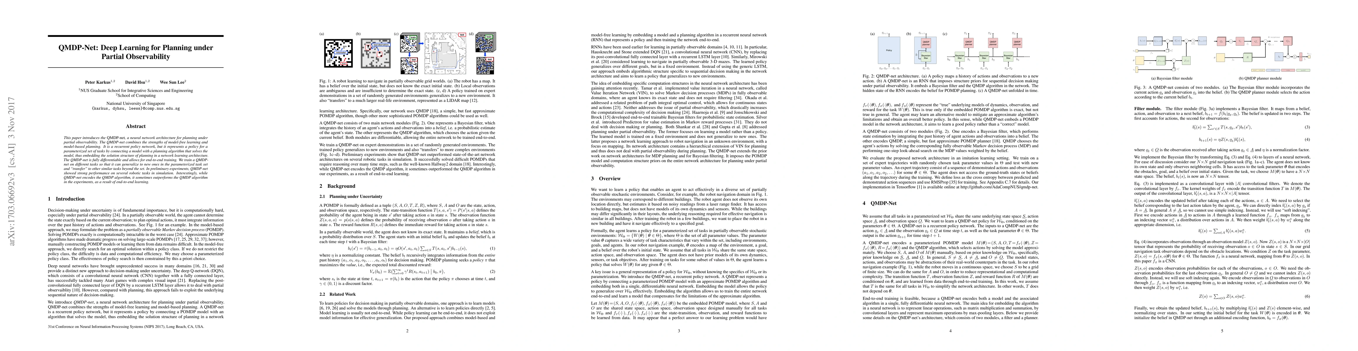 The QMDP-net is a neural network architecture designed for planning under partial observability, combining model-free learning and model-based planning. It demonstrates strong performance on robotic tasks and sometimes outperforms traditional QMDP algorithms due to end-to-end learning.