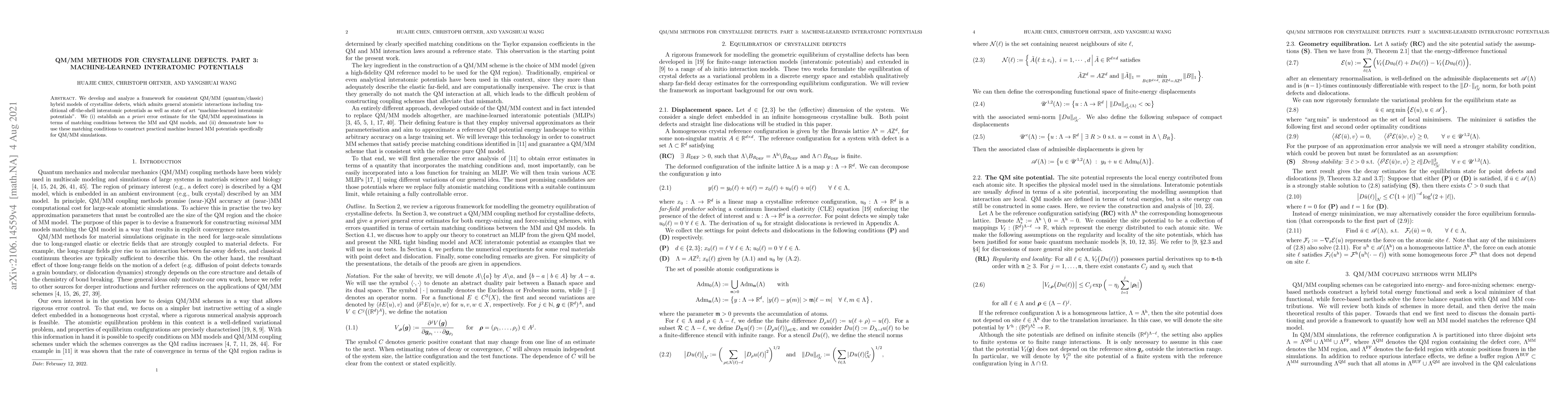 This paper develops a framework for QM/MM hybrid models of crystalline defects, incorporating machine-learned interatomic potentials. It establishes an error estimate for QM/MM approximations and demonstrates the construction of practical machine-learned potentials for these simulations.