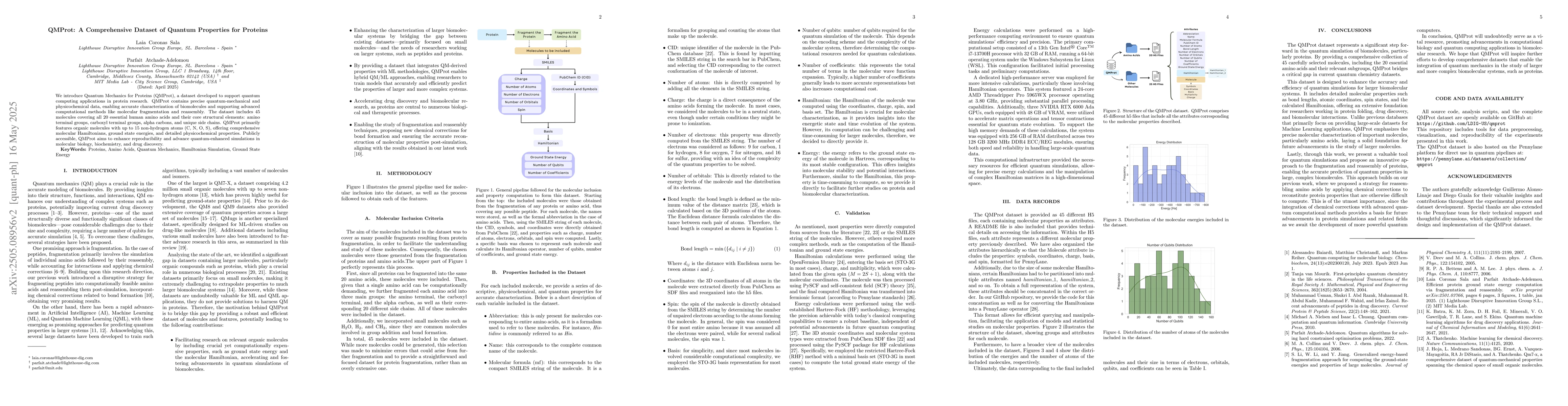 The paper outlines the development of QMProt, a dataset encompassing quantum-mechanical and physicochemical data for 45 molecules representing all 20 essential human amino acids and their structural elements, with a focus on organic molecules containing up to 15 non-hydrogen atoms.