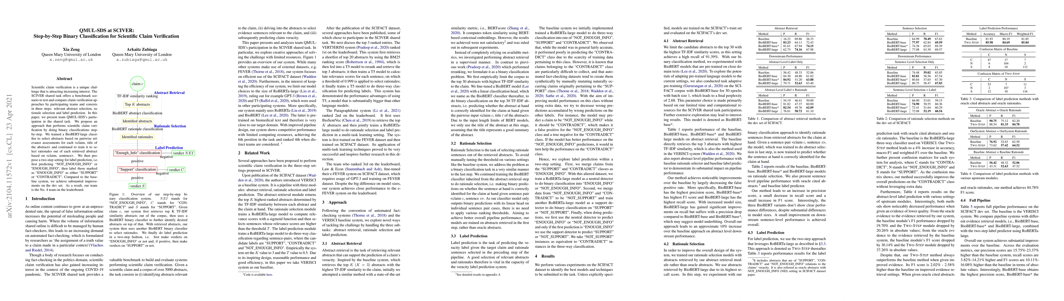 The QMUL-SDS team used a step-by-step binary classification approach for scientific claim verification in SCIVER, achieving notable improvements over the baseline. They employed BioBERT-large for selecting relevant abstracts and rationales, followed by a two-step label prediction to classify claims as either supporting, contradicting, or lacking sufficient information.