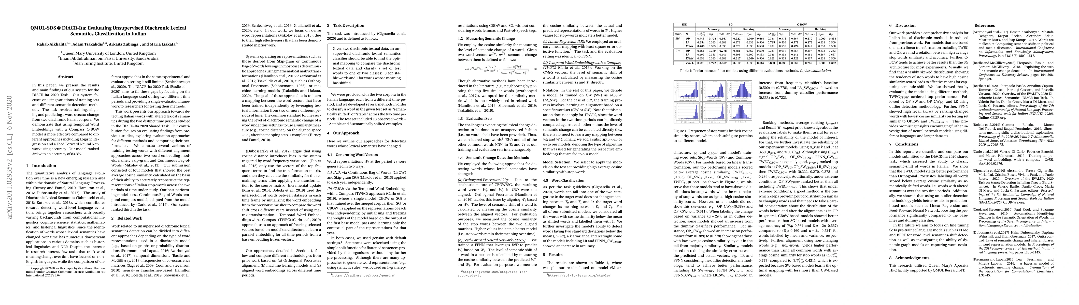 This paper evaluates an unsupervised diachronic lexical semantics classification system for Italian, showing that Temporal Word Embeddings with a Compass C-BOW model outperform Logistic Regression and Neural Networks, achieving an accuracy of 83.3% and ranking 3rd in the DIACR-ITA 2020 Task.