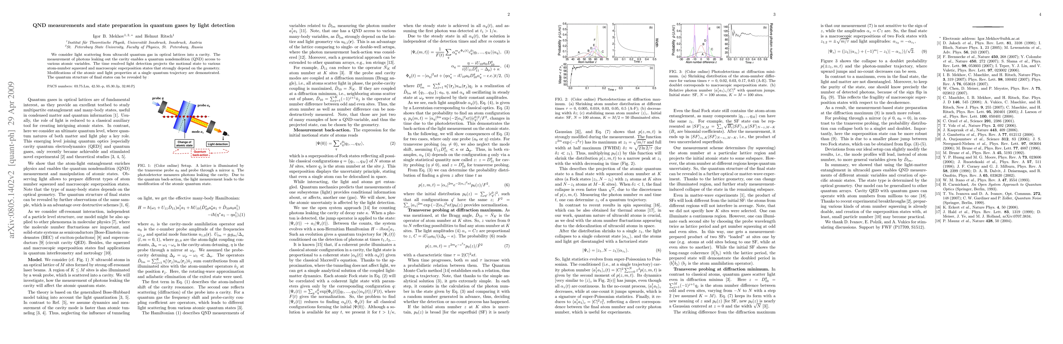 We consider light scattering from ultracold atoms trapped in an optical lattice into a cavity. The measurement of photons leaking out the cavity provides a quantum nondemolition (QND) access to various atomic variables. Depending on the chosen geometry the time resolved light detection projects the atomic quantum state to various atom-number squeezed and Schroedinger cat states. Modifications of the atomic and light properties at a single quantum trajectory are demonstrated. The quantum structure of final states can be revealed by further observations of the same sample.
