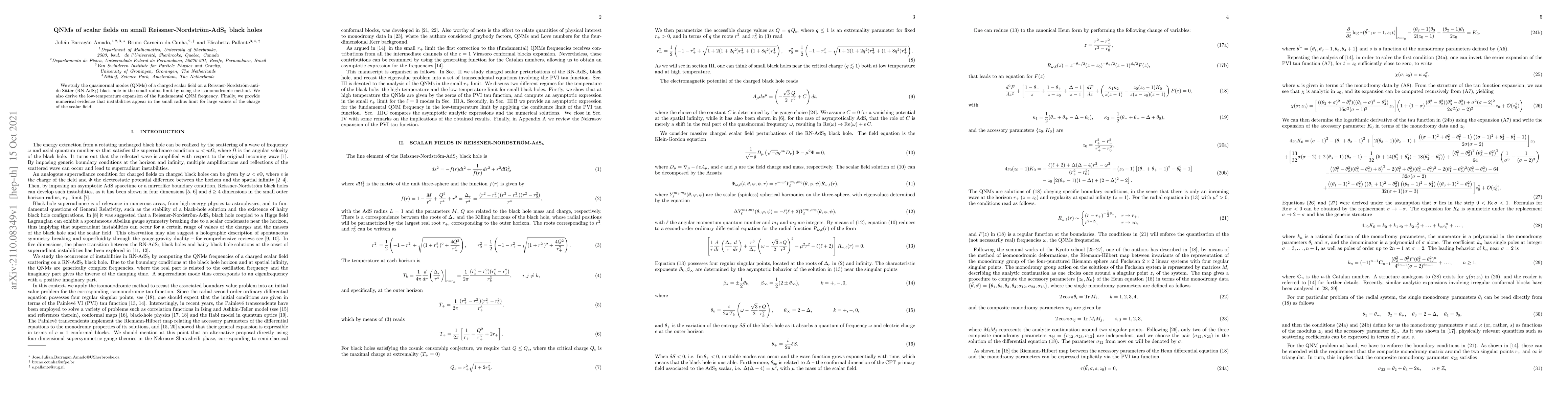 We study the quasinormal modes (QNMs) of a charged scalar field on a Reissner-Nordstr\"{o}m-anti-de Sitter (RN-AdS$_{5}$) black hole in the small radius limit by using the isomonodromic method. We also derive the low-temperature expansion of the fundamental QNM frequency. Finally, we provide numerical evidence that instabilities appear in the small radius limit for large values of the charge of the scalar field.