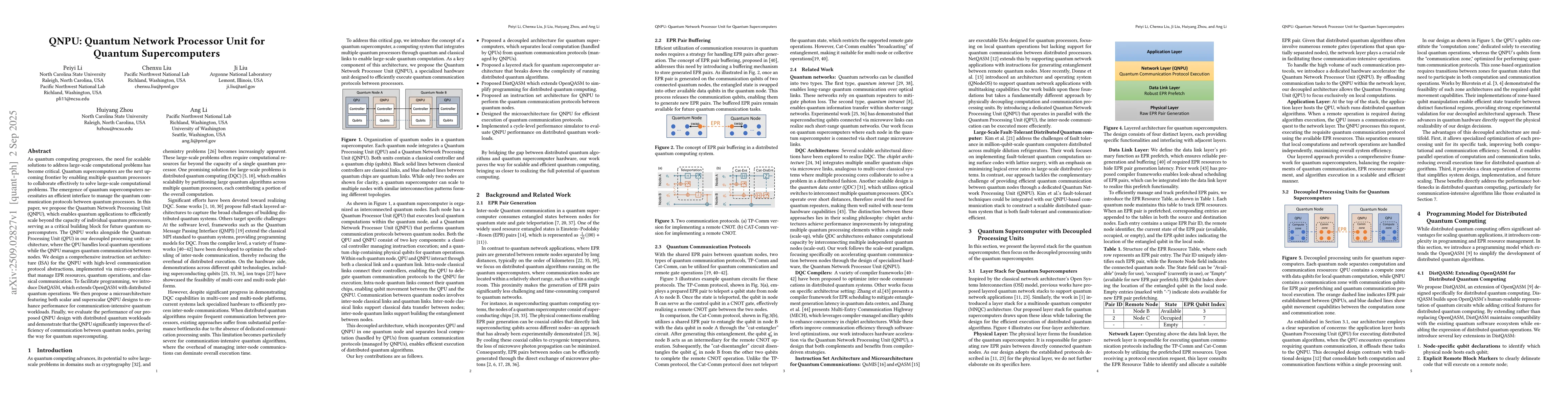 As quantum computing progresses, the need for scalable solutions to address large-scale computational problems has become critical. Quantum supercomputers are the next upcoming frontier by enabling multiple quantum processors to collaborate effectively to solve large-scale computational problems. The emergence of quantum supercomputers necessitates an efficient interface to manage the quantum communication protocols between quantum processors. In this paper, we propose the Quantum Network Processing Unit (QNPU), which enables quantum applications to efficiently scale beyond the capacity of individual quantum processors, serving as a critical building block for future quantum supercomputers. The QNPU works alongside the Quantum Processing Unit (QPU) in our decoupled processing units architecture, where the QPU handles local quantum operations while the QNPU manages quantum communication between nodes. We design a comprehensive instruction set architecture (ISA) for the QNPU with high-level communication protocol abstractions, implemented via micro-operations that manage EPR resources, quantum operations, and classical communication. To facilitate programming, we introduce DistQASM, which extends OpenQASM with distributed quantum operations. We then propose a microarchitecture featuring both scalar and superscalar QNPU designs to enhance performance for communication-intensive quantum workloads. Finally, we evaluate the performance of our proposed QNPU design with distributed quantum workloads and demonstrate that the QNPU significantly improves the efficiency of communication between quantum nodes, paving the way for quantum supercomputing.