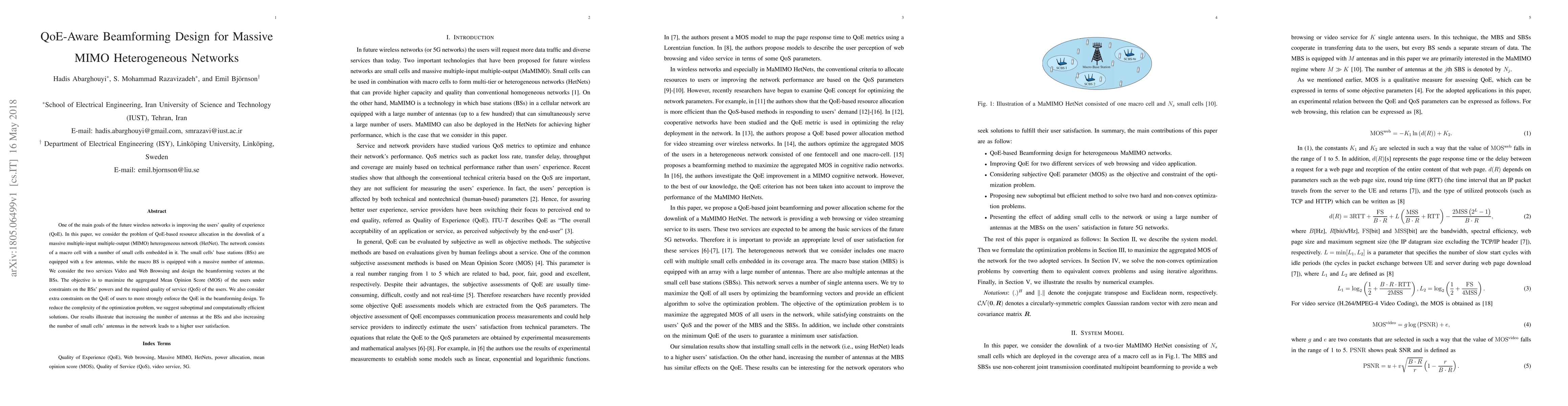 One of the main goals of the future wireless networks is improving the users quality of experience (QoE). In this paper, we consider the problem of QoE-based resource allocation in the downlink of a massive multiple-input multiple-output (MIMO) heterogeneous network (HetNet). The network consists of a macro cell with a number of small cells embedded in it. The small cells base stations (BSs) are equipped with a few antennas, while the macro BS is equipped with a massive number of antennas. We consider the two services Video and Web Browsing and design the beamforming vectors at the BSs. The objective is to maximize the aggregated Mean Opinion Score (MOS) of the users under constraints on the BSs powers and the required quality of service (QoS) of the users. We also consider extra constraints on the QoE of users to more strongly enforce the QoE in the beamforming design. To reduce the complexity of the optimization problem, we suggest suboptimal and computationally efficient solutions. Our results illustrate that increasing the number of antennas at the BSs and also increasing the number of small cells antennas in the network leads to a higher user satisfaction.
